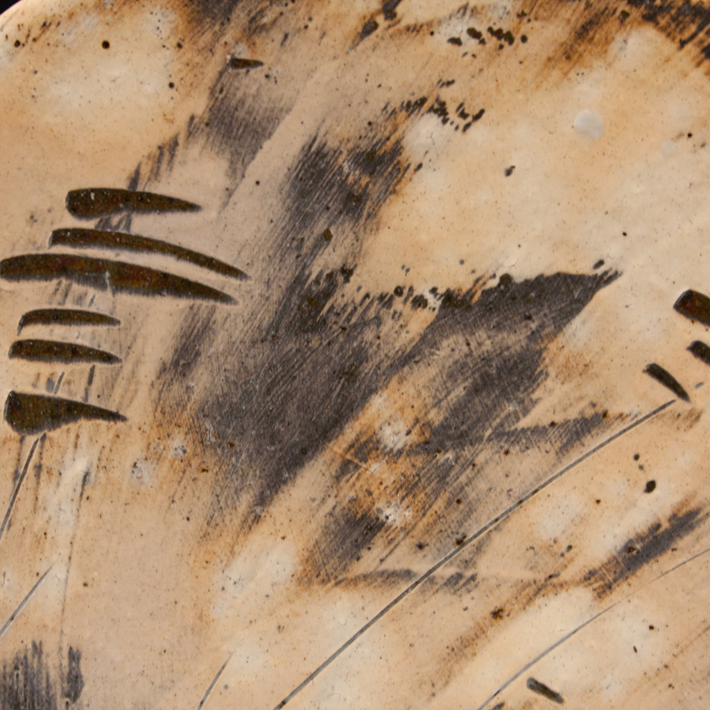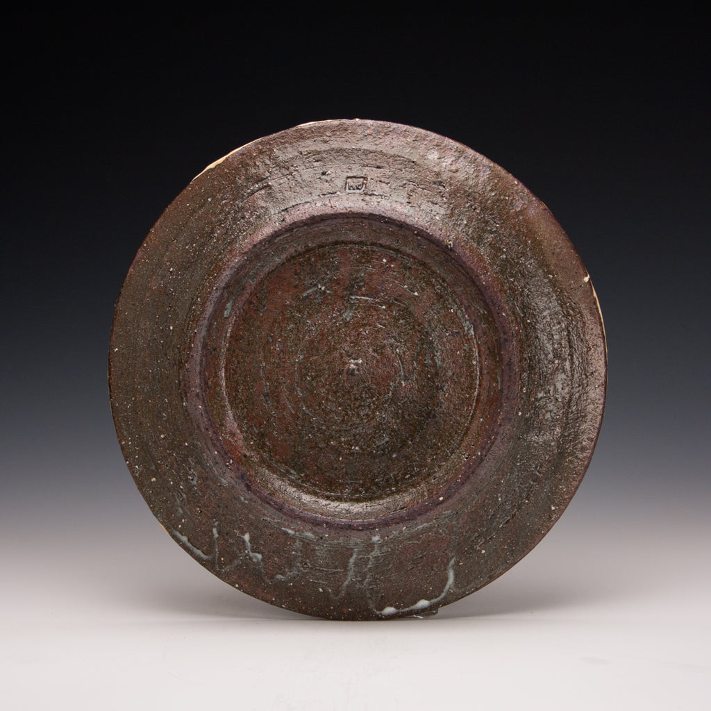 Wood fired local red clay.  White slip and  clear glaze.  10.25 x 1.25