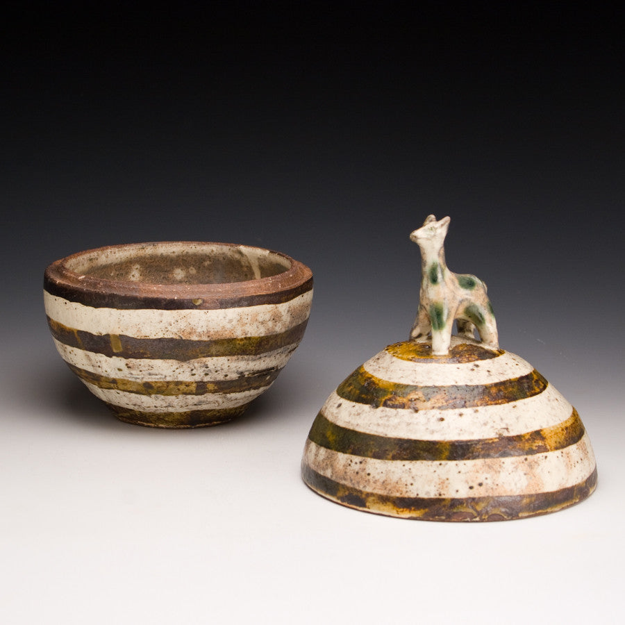 Wood fired local red clay. White slip under clear glaze with wax resist and iron wash and green. 9 x 6