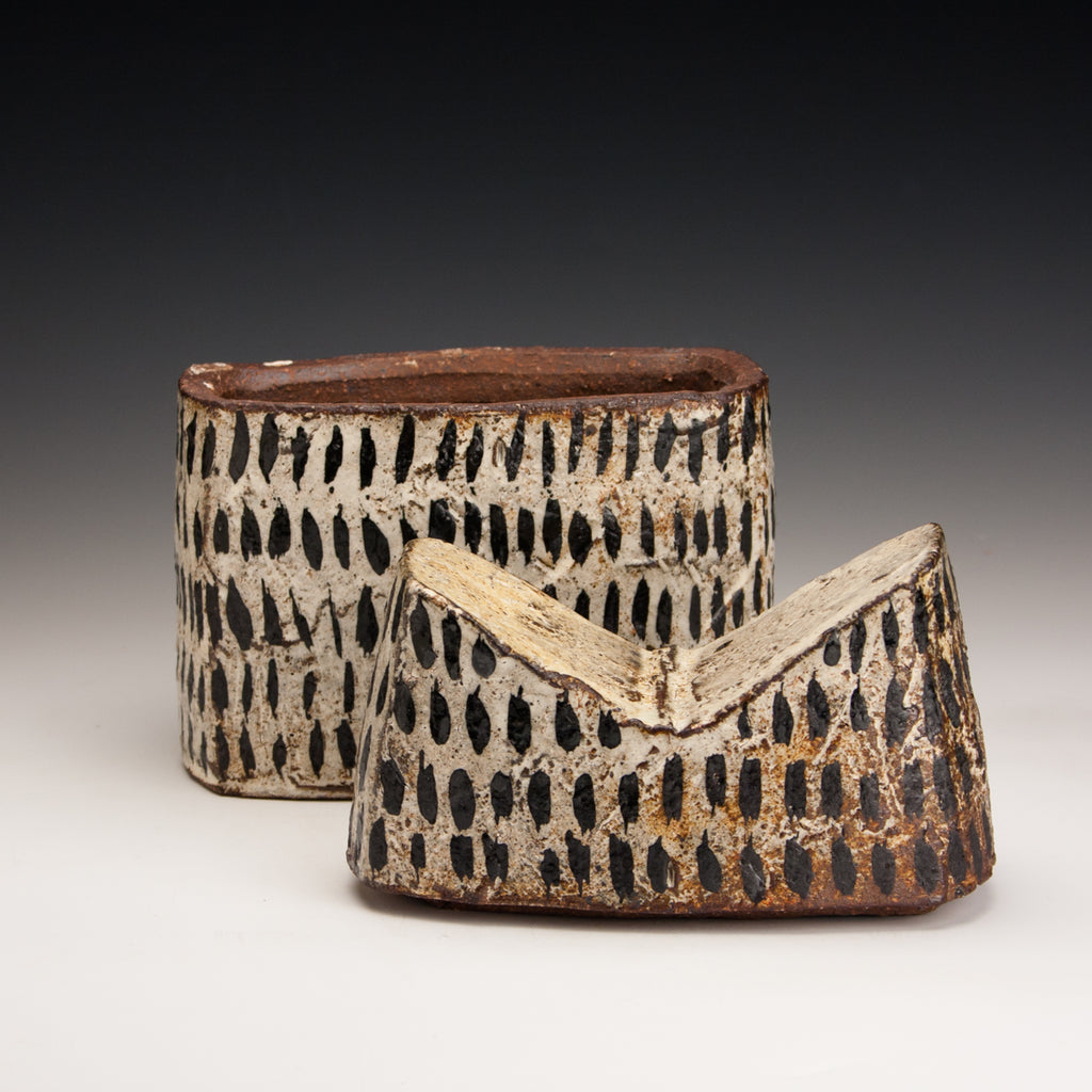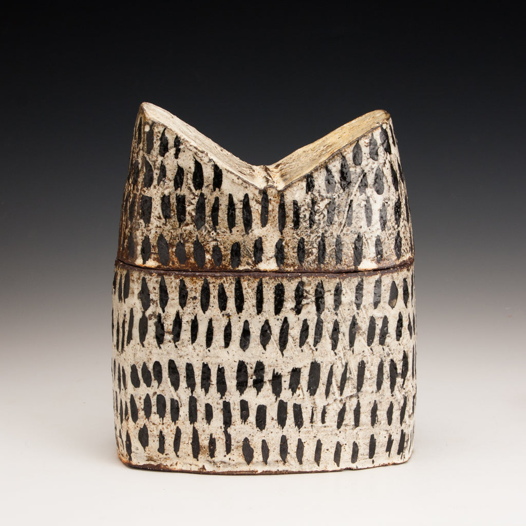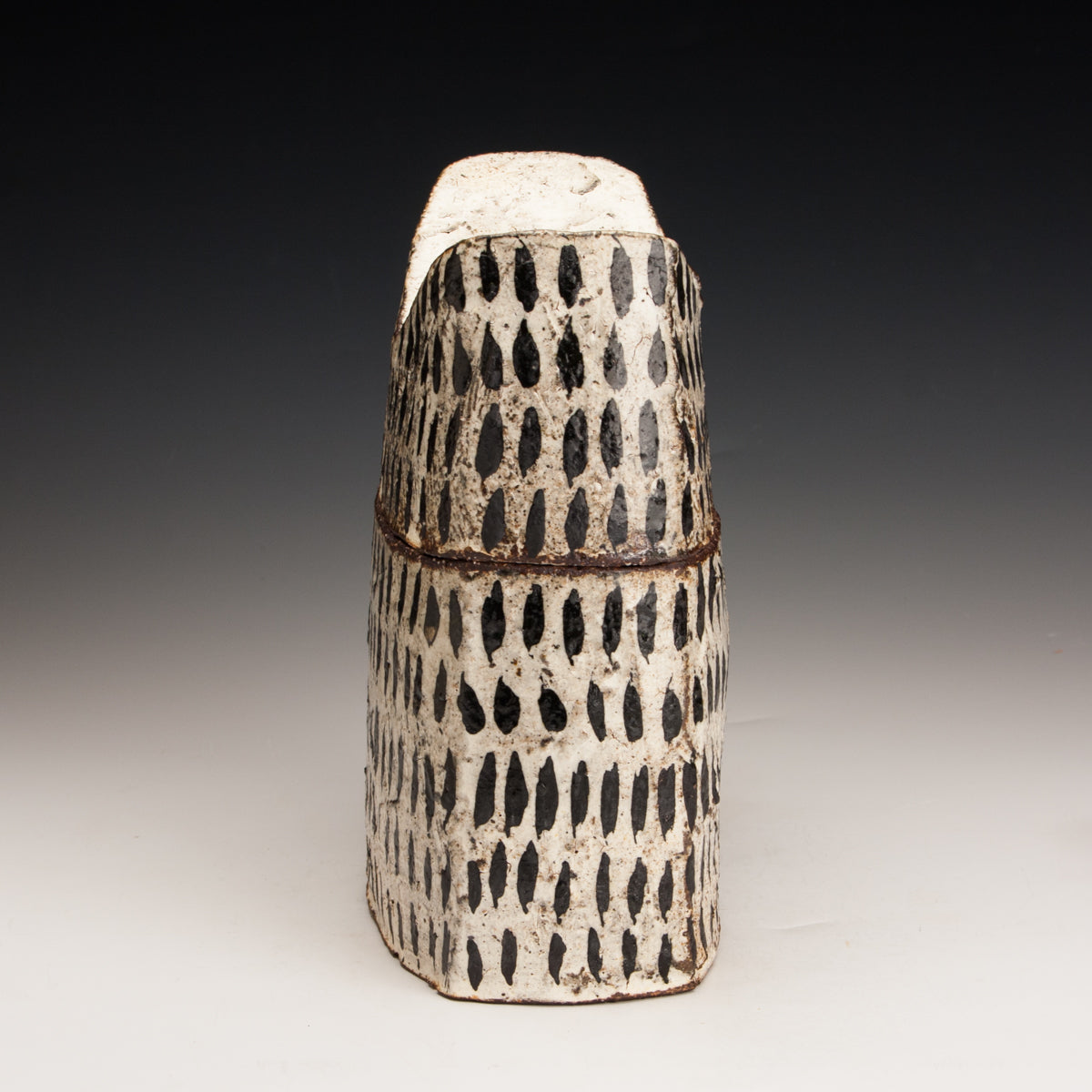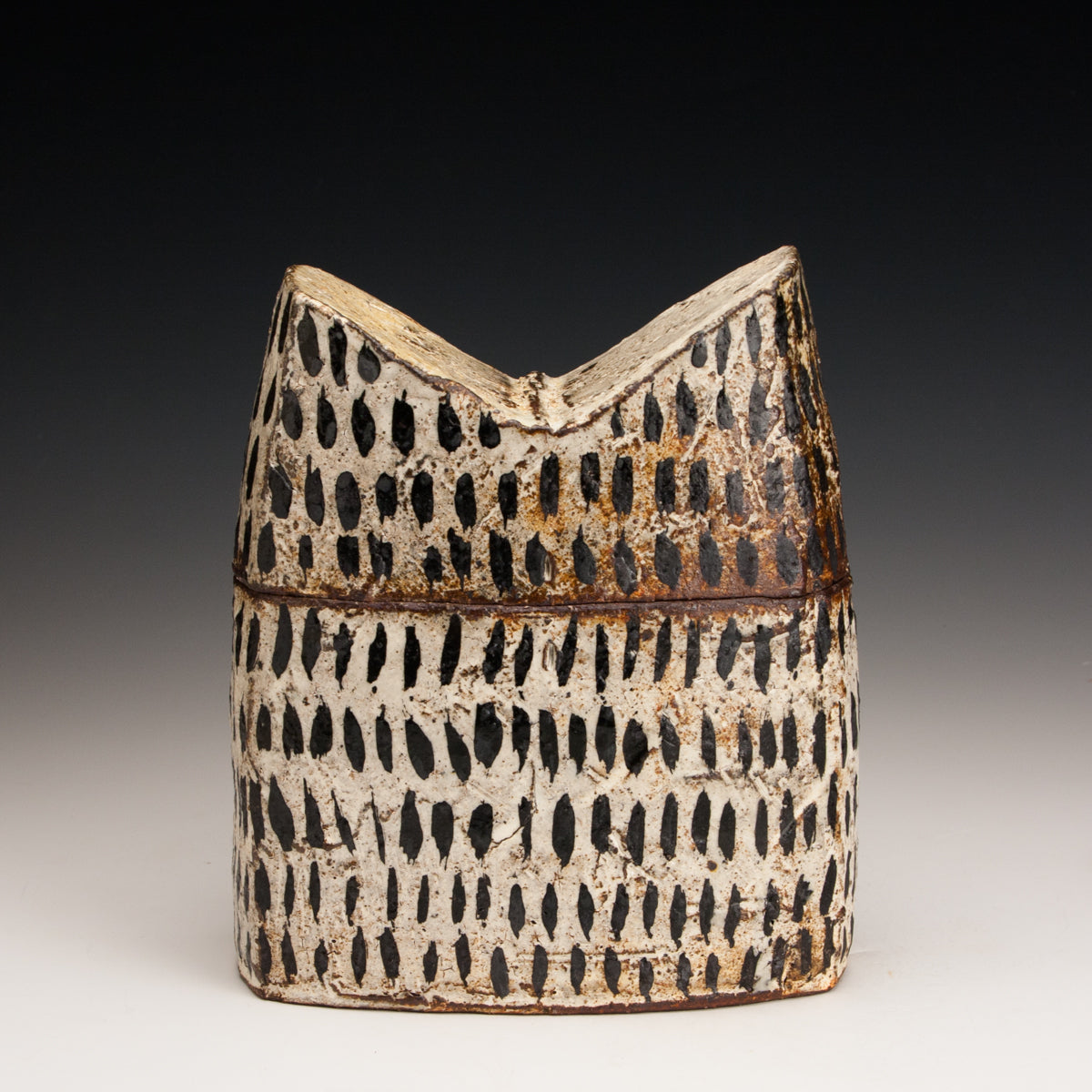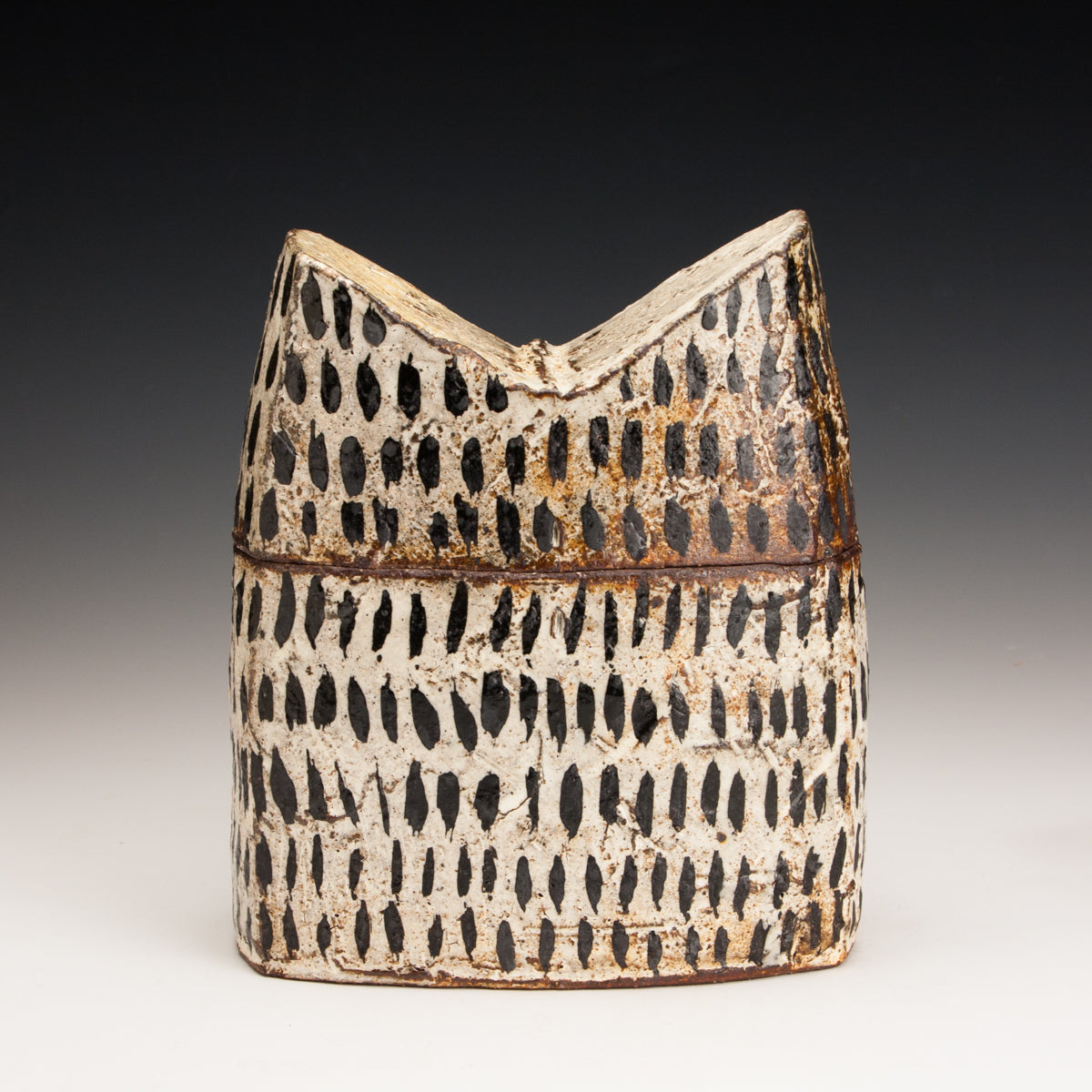 Wood fired local red clay. bandana kaolin, black deco and punching glaze. 7.75 x 8.5 x 3.25