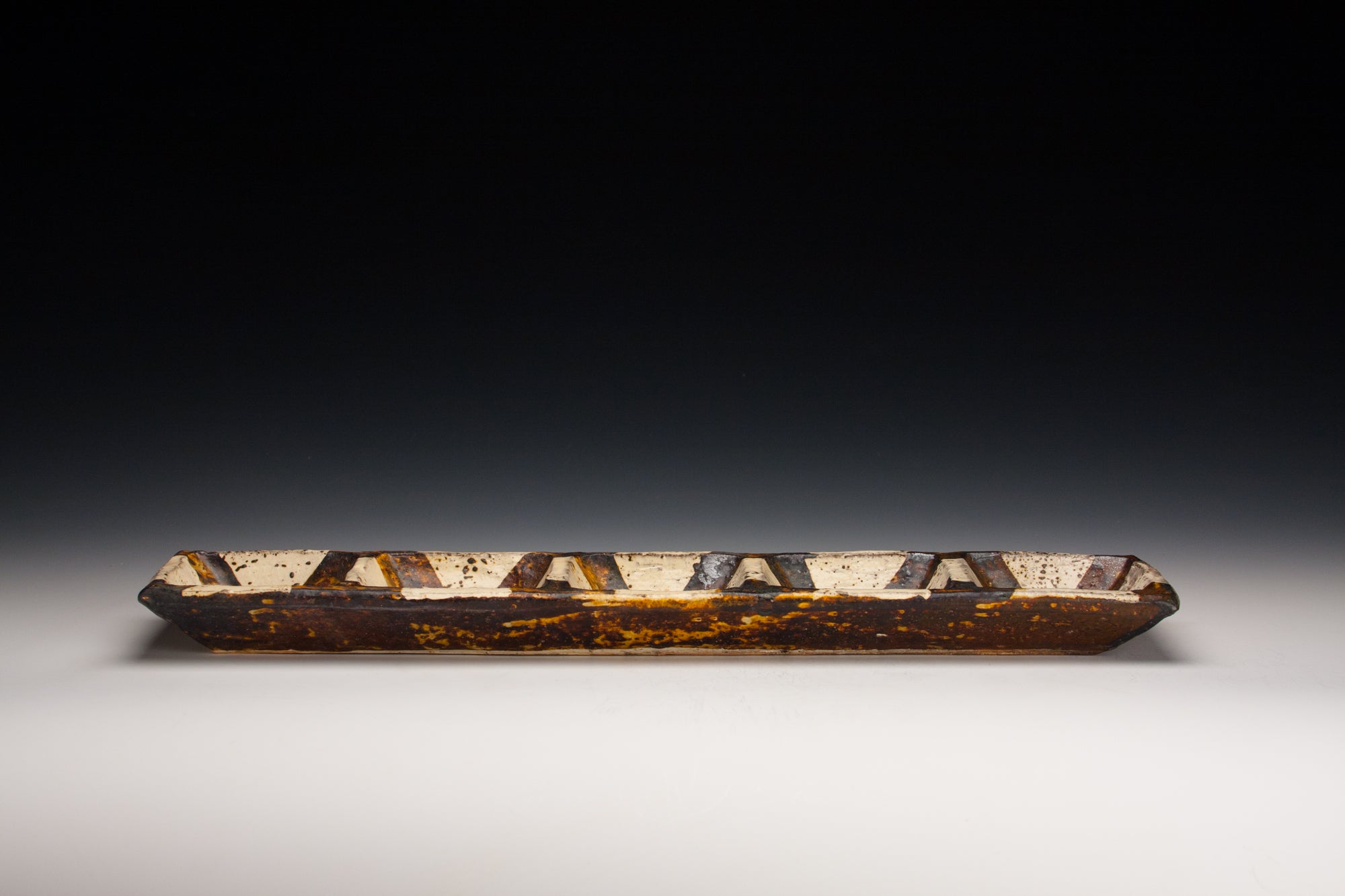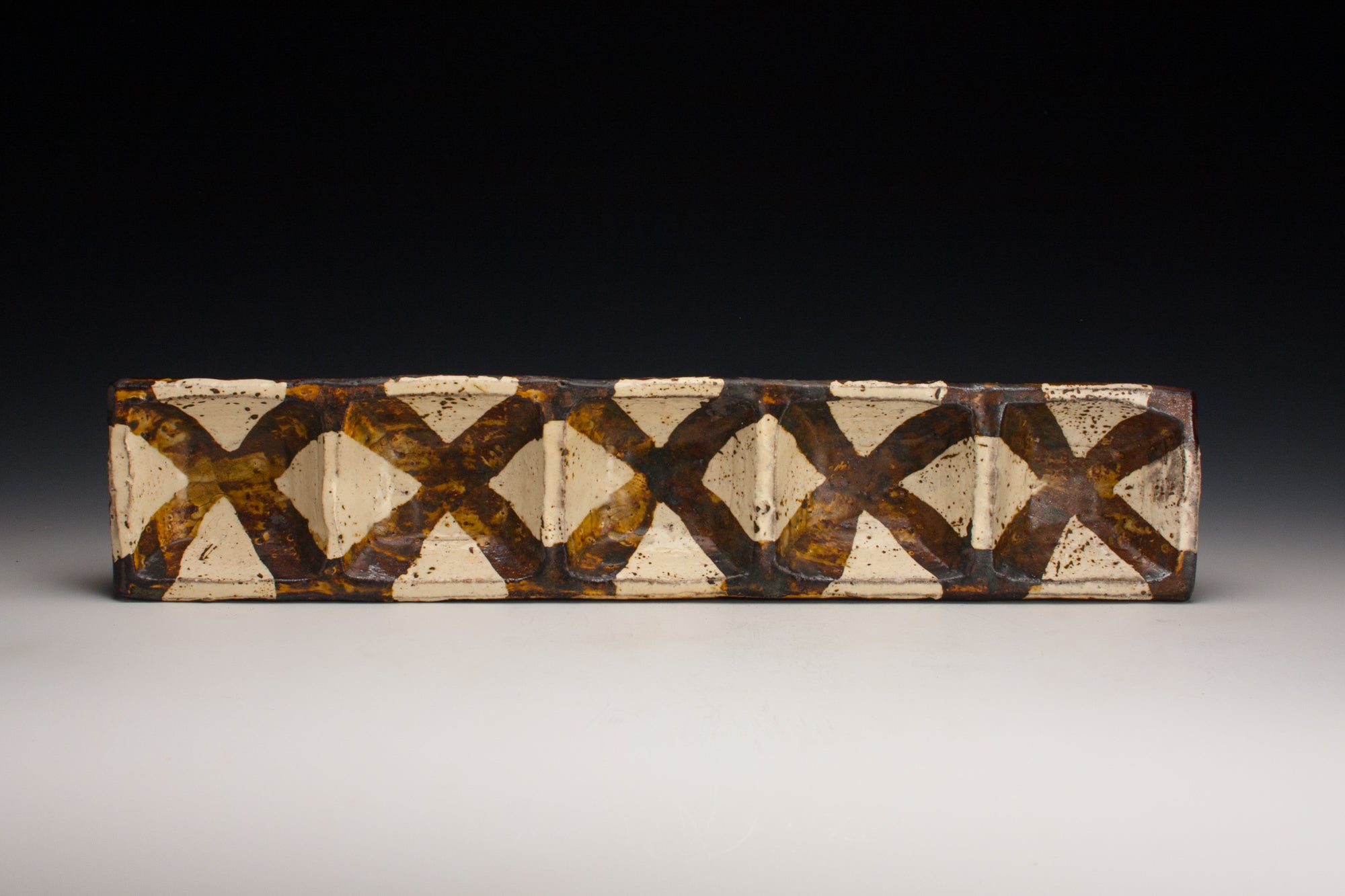 Wood fired local red clay. Wax resist and iron wash. 17.5 x 3.75 x 1.25