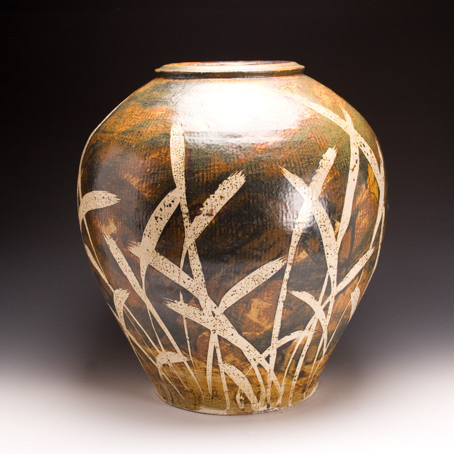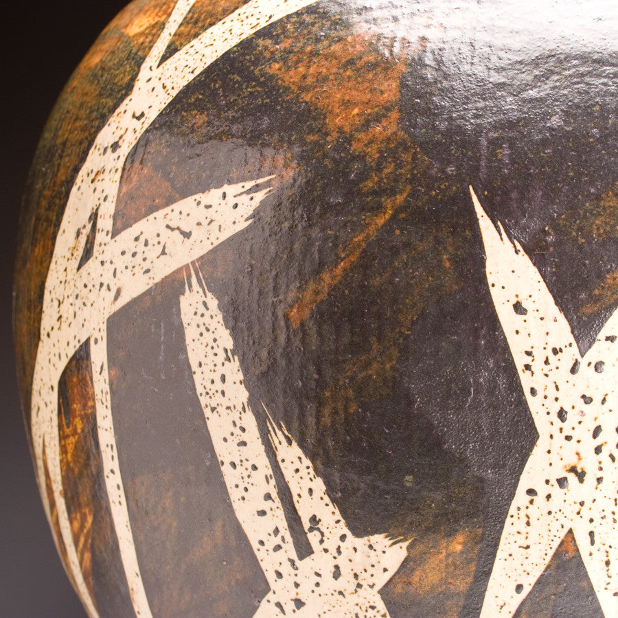 Wood fired local red clay. Wax resist and iron wash. 20 x 18 x 18