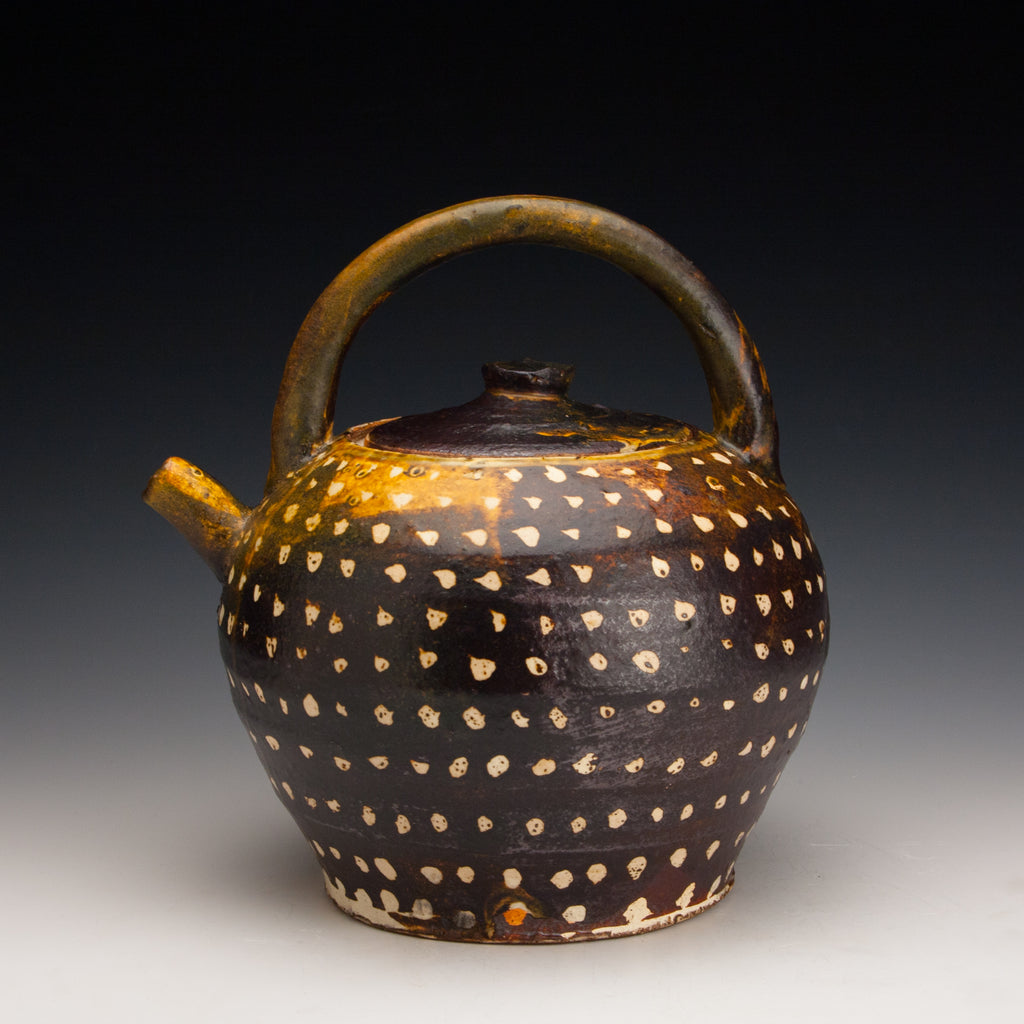 Wood fired local red clay. Wax resist and iron wash. 7.75 x 6.5 x 9