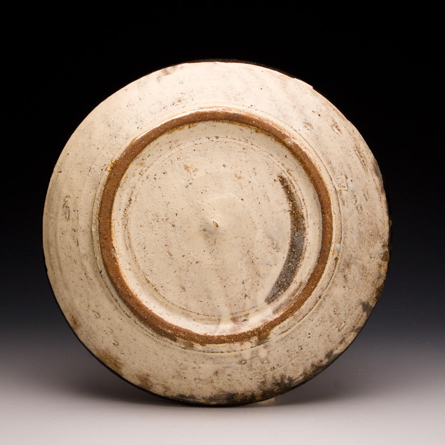 Wood fired local red clay. White slip and iron oxide under clear glaze. 9.75 x 1.75