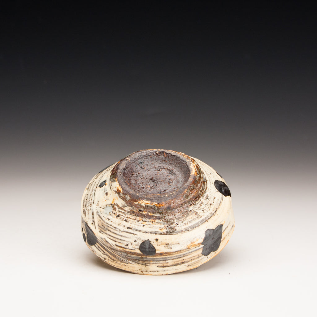 Wood fired local red clay. Brushed white slip, clear glaze and black iron. 4 x 1.75