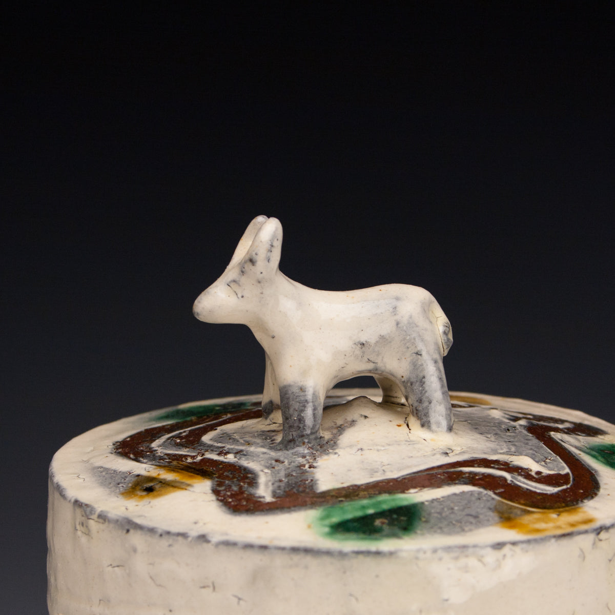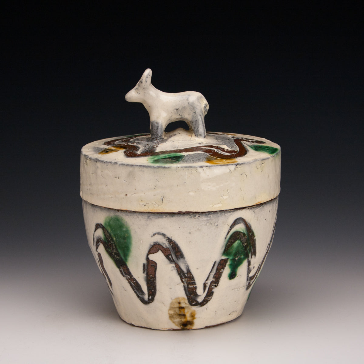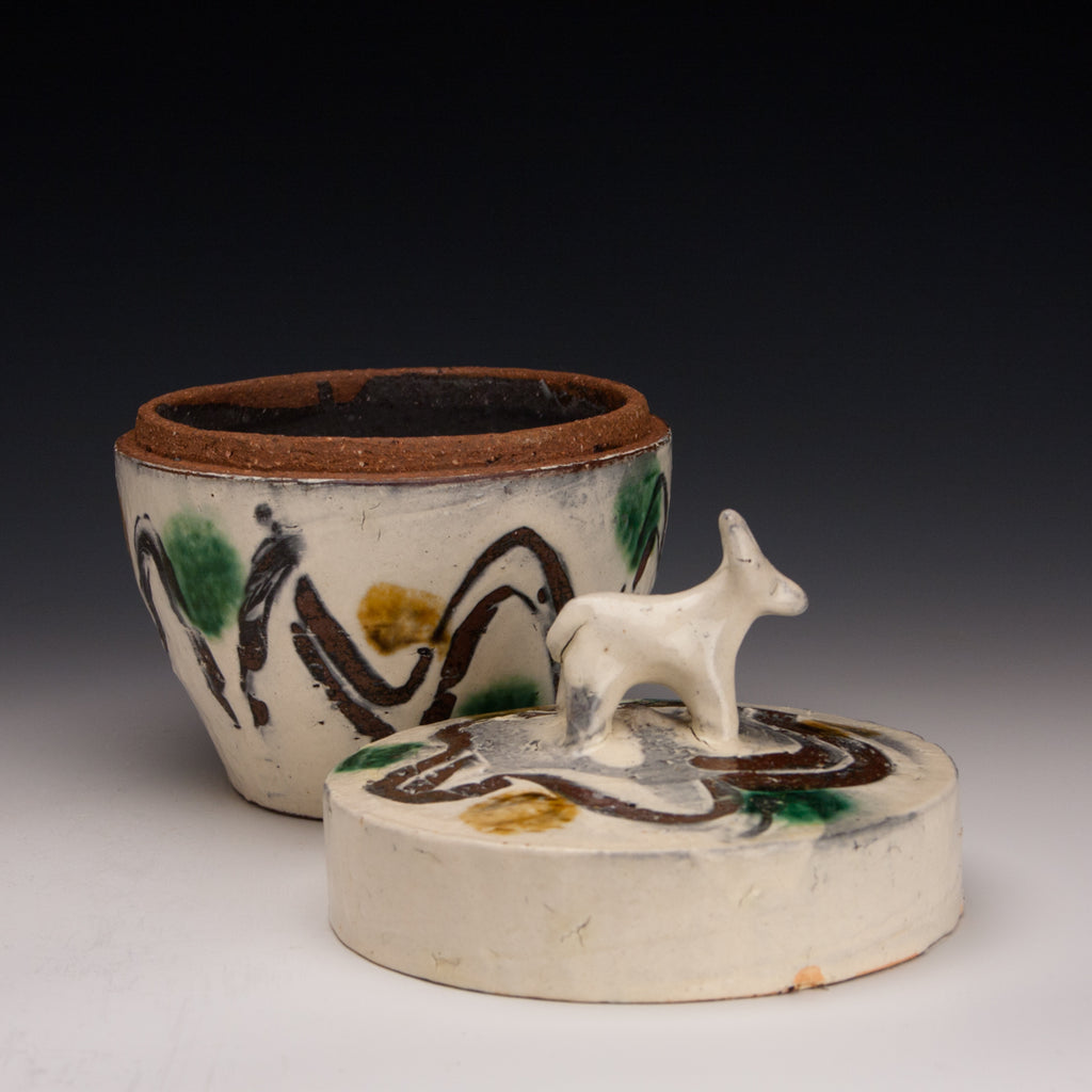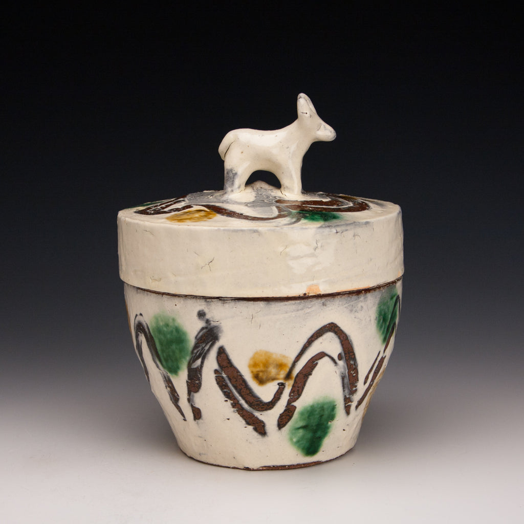 Wood fired local red clay. White slip, finger wipes, clear glaze, amber and green. 6.75 x 6