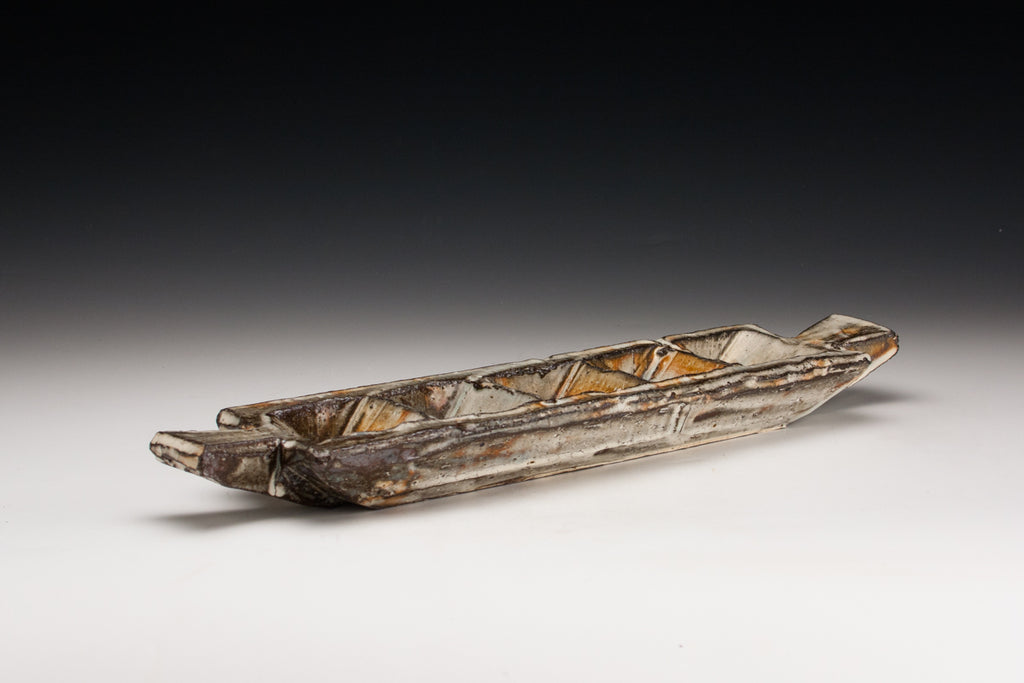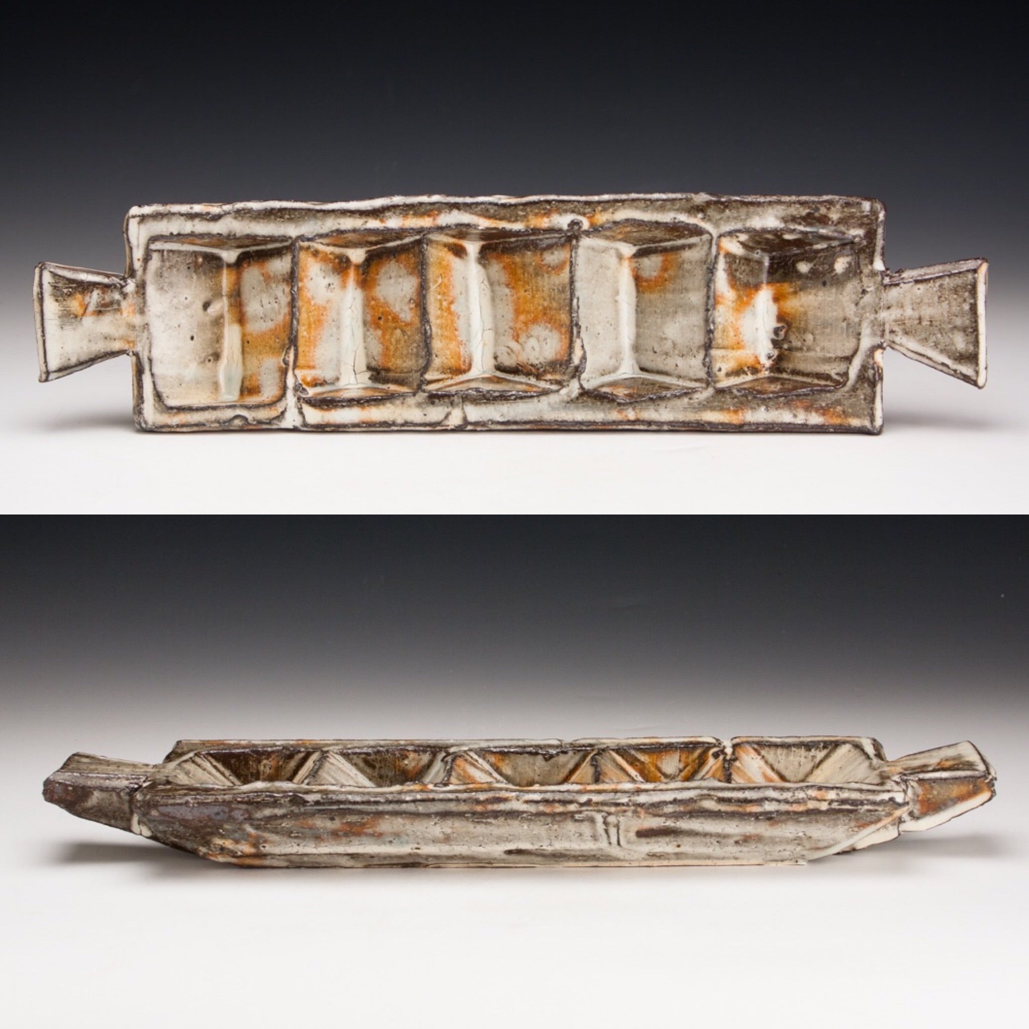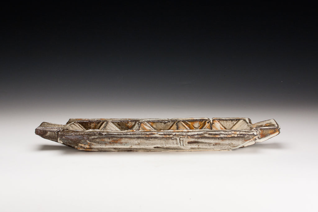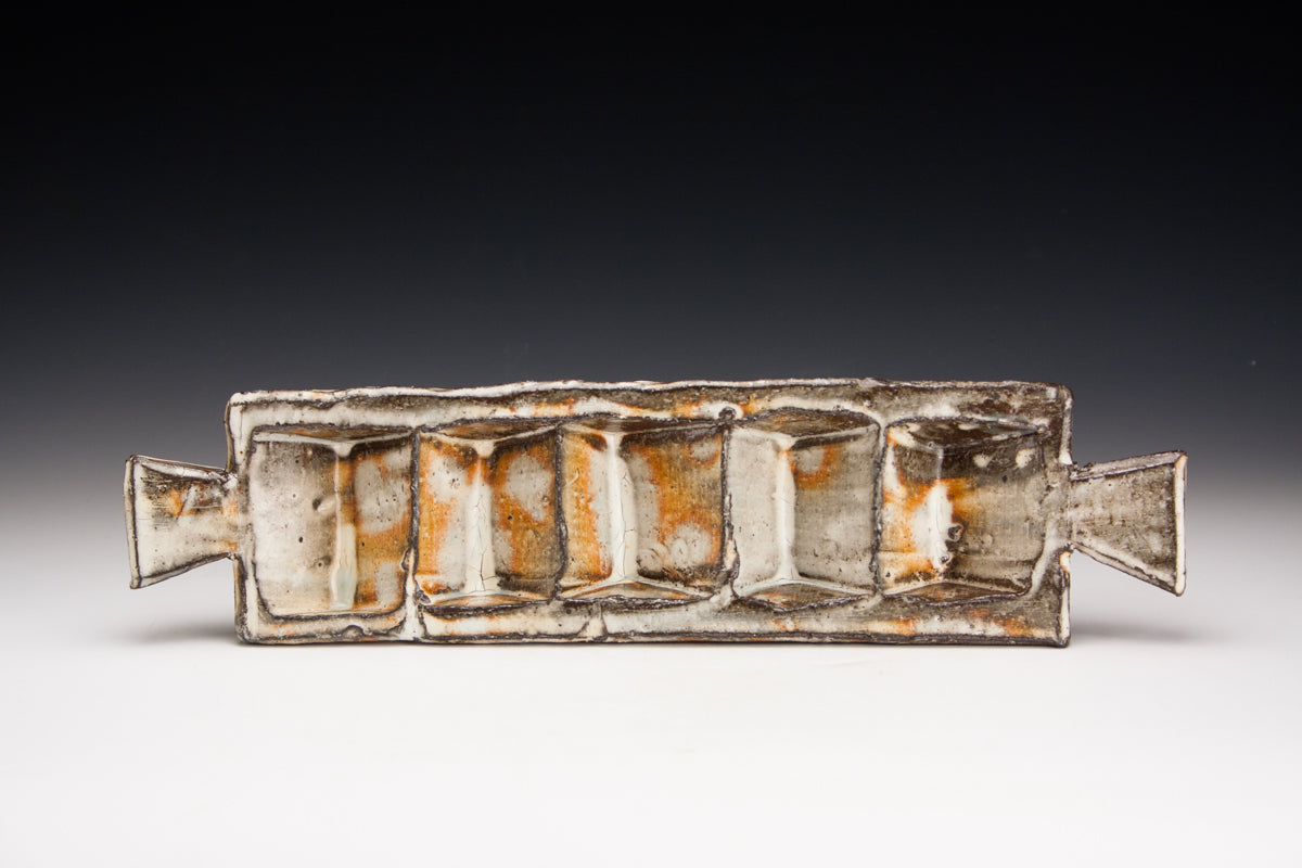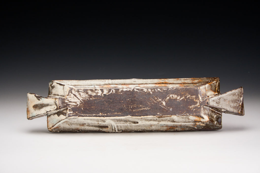 Local red clay. White slip and punchong glaze. 13.75 x 3.5 x 1.5