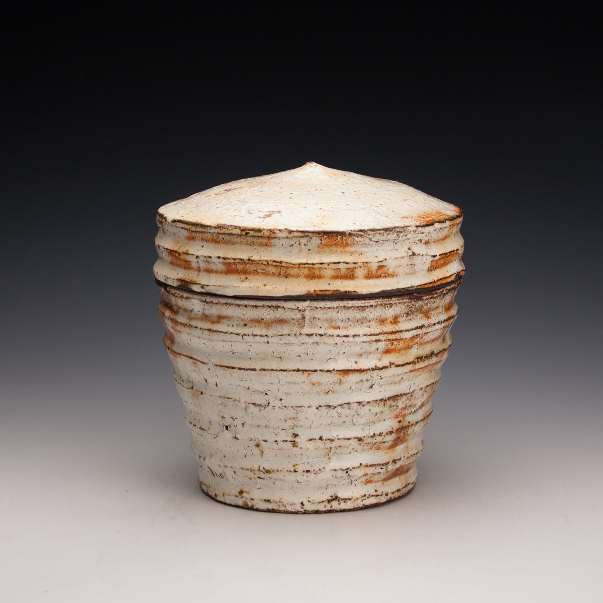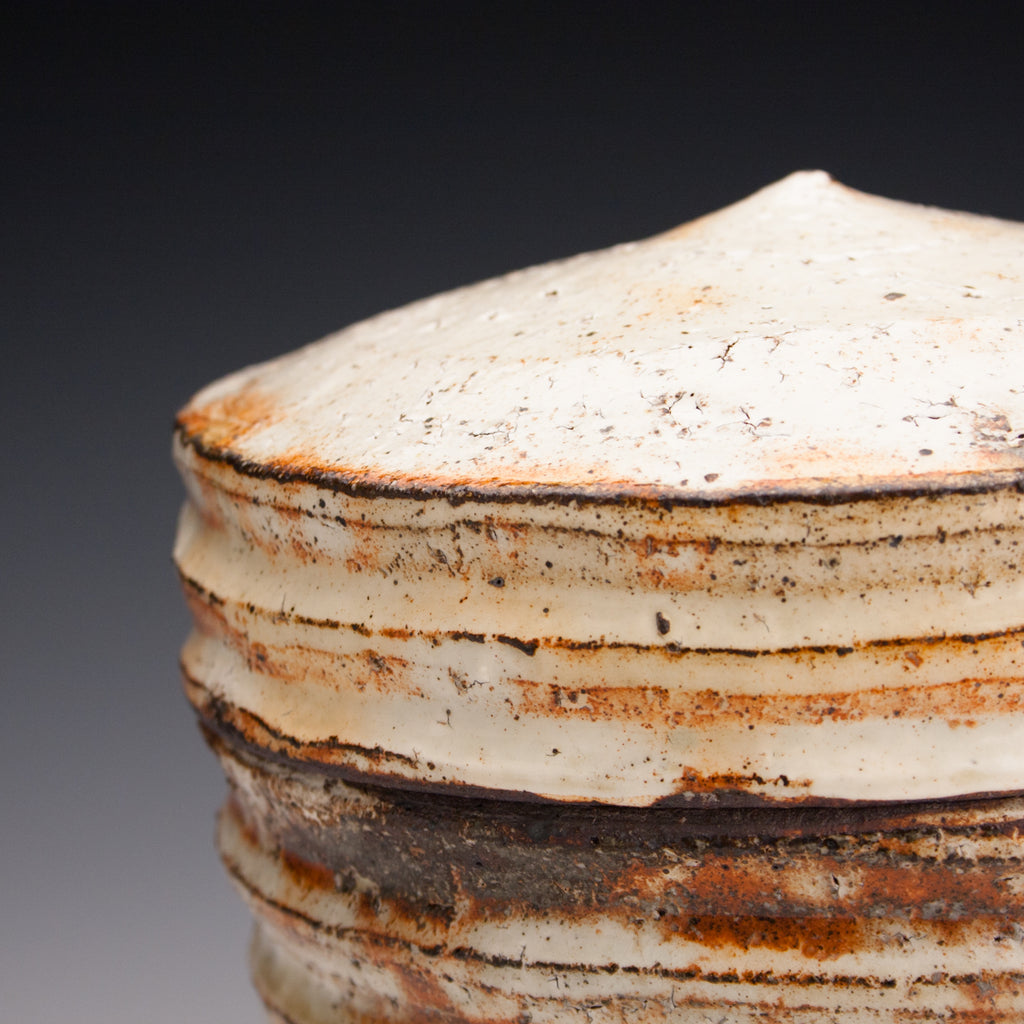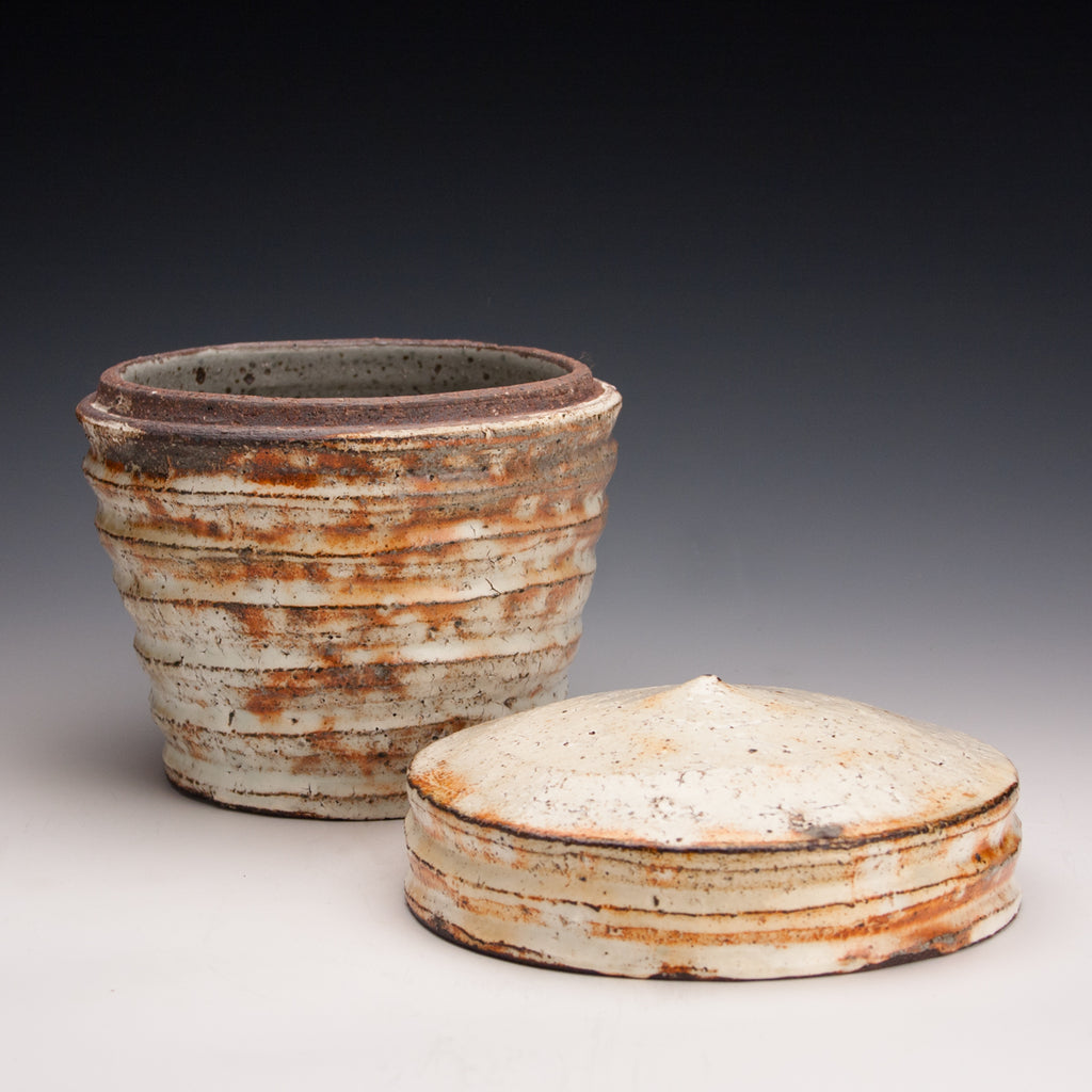 Wood fired local red clay. White slip, clear glaze. 7 x 6
