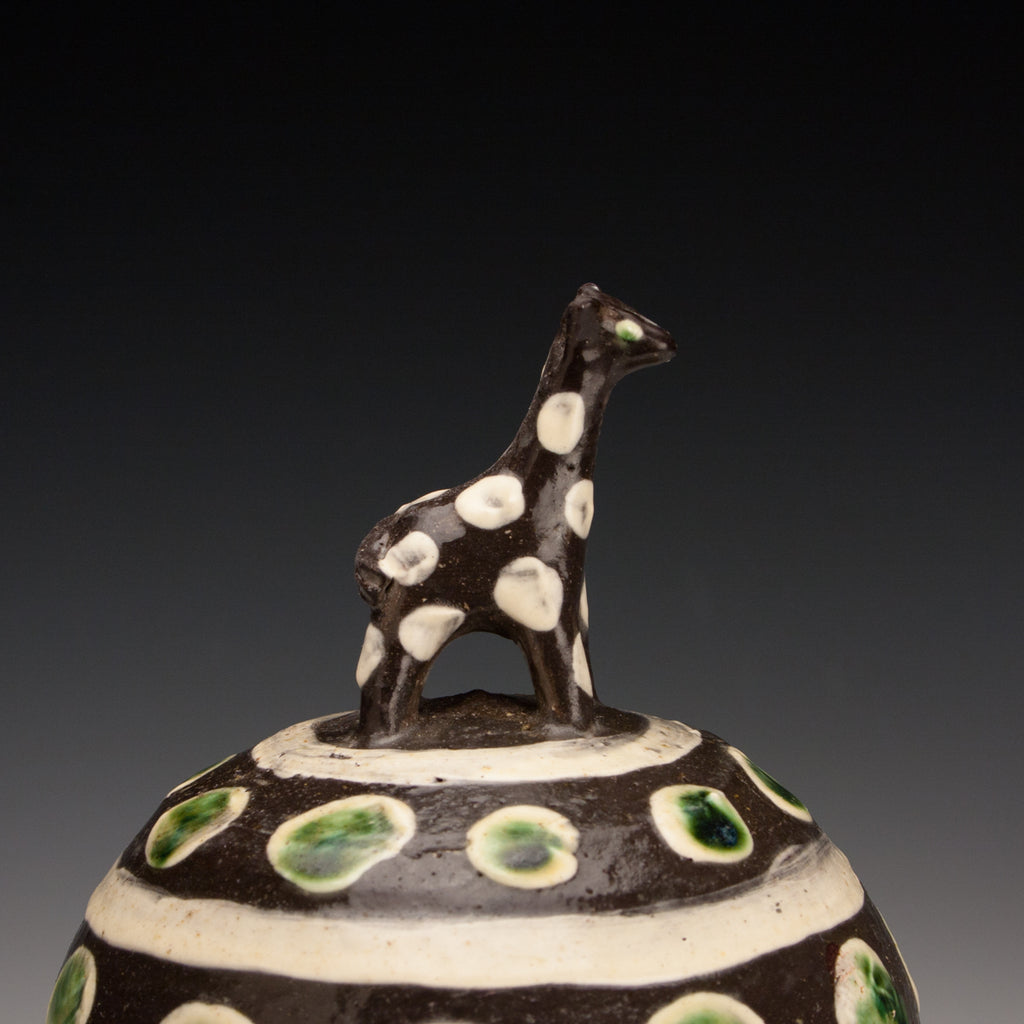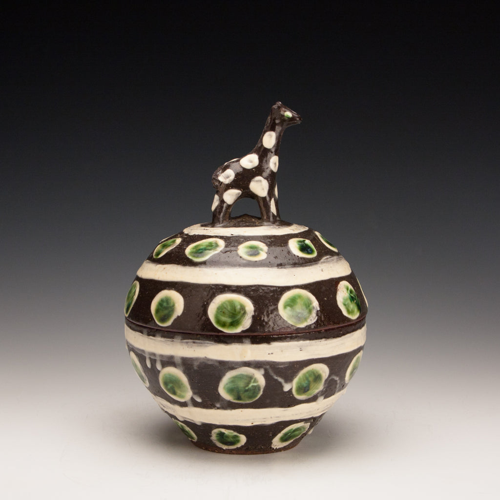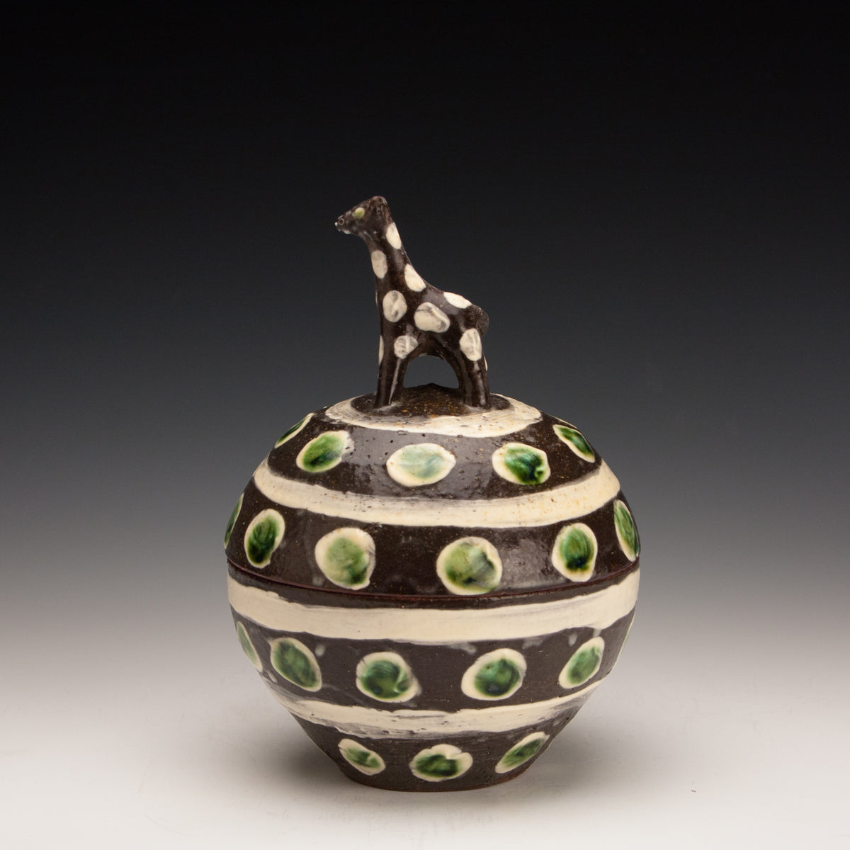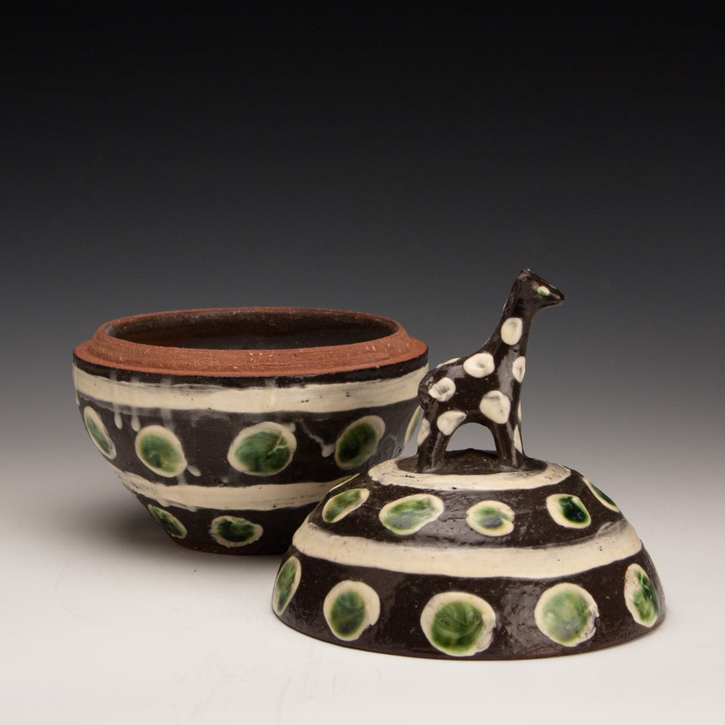 Wood fired local red clay. Clear glaze,white slip, and green dots. 8 x 4.5