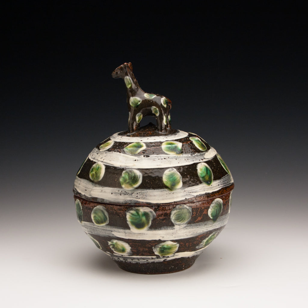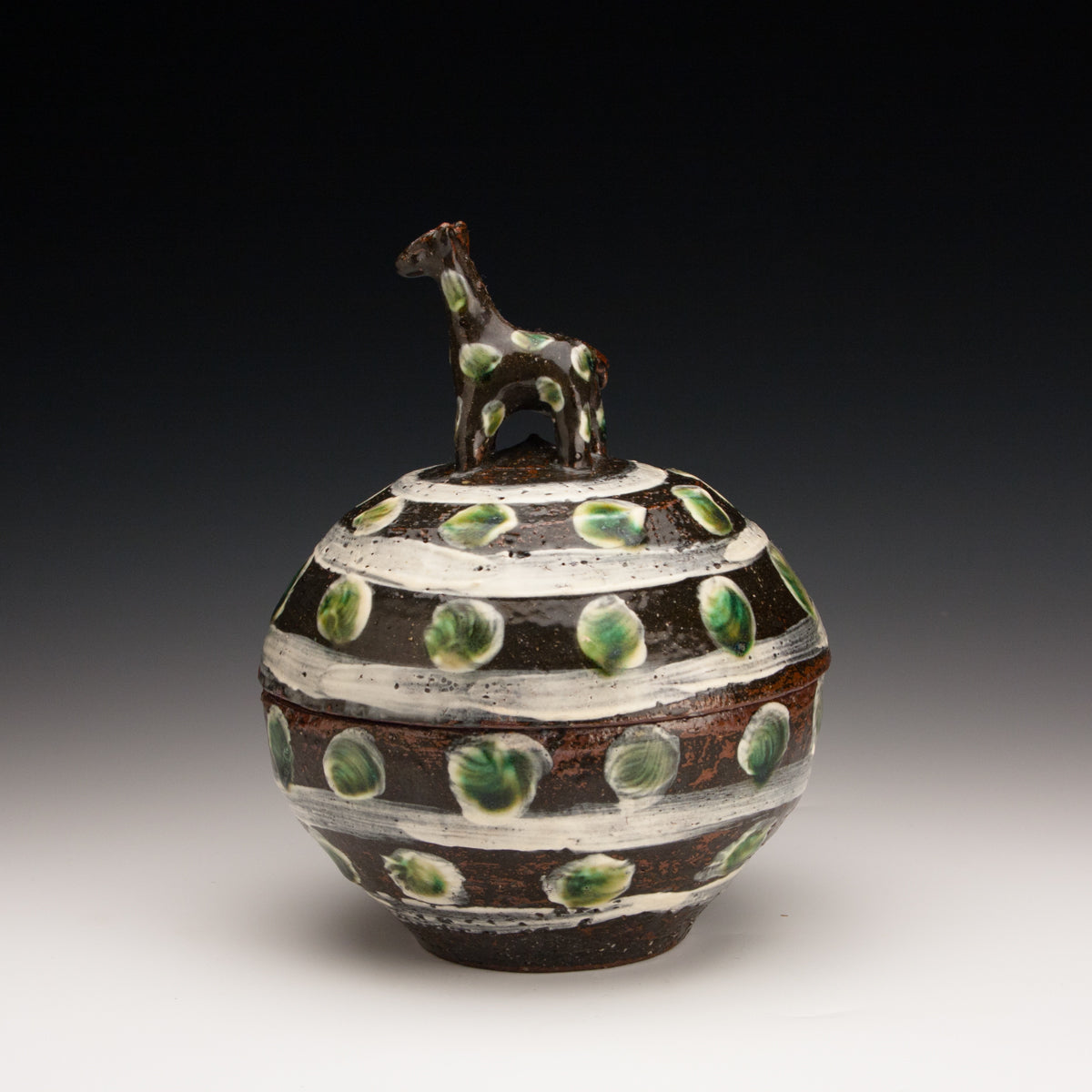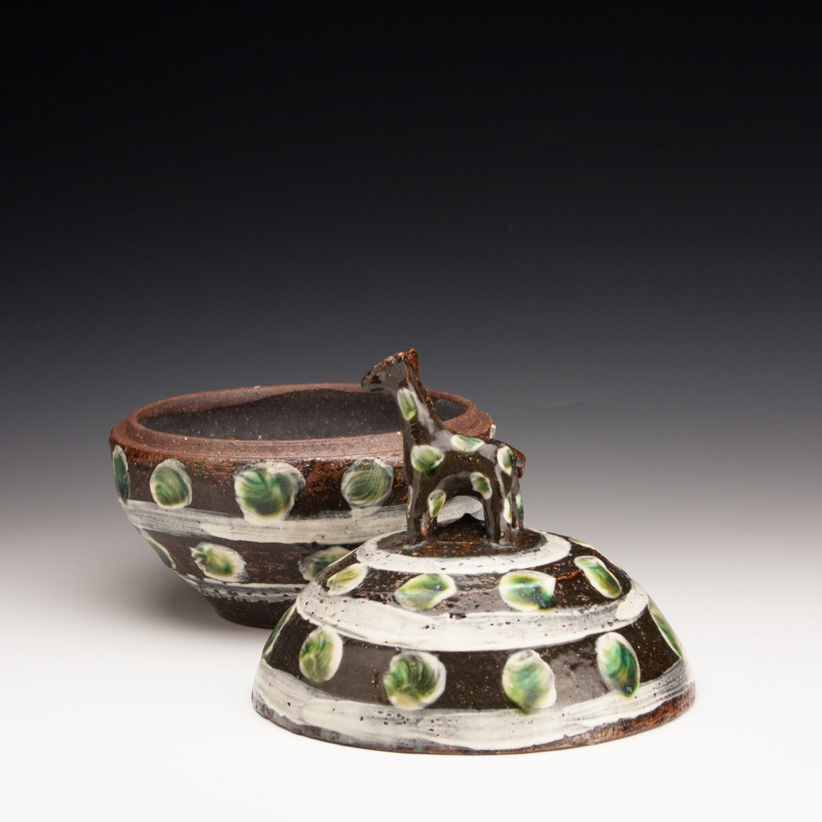 Wood fired local red clay. Iron slip, white slip and green deco. 9 x 6