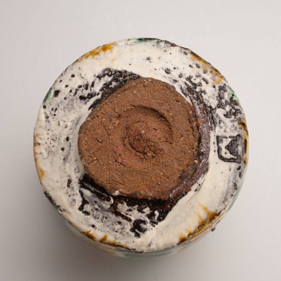 Wood fired local red clay. Hakame slip and Green and Amber stripes. 3 x 4