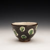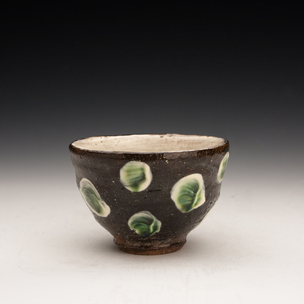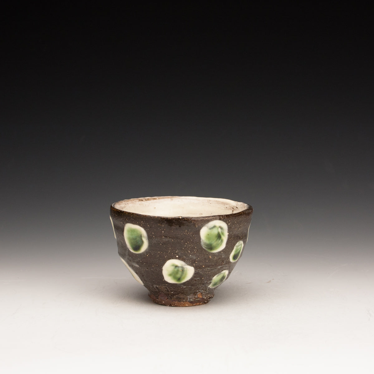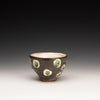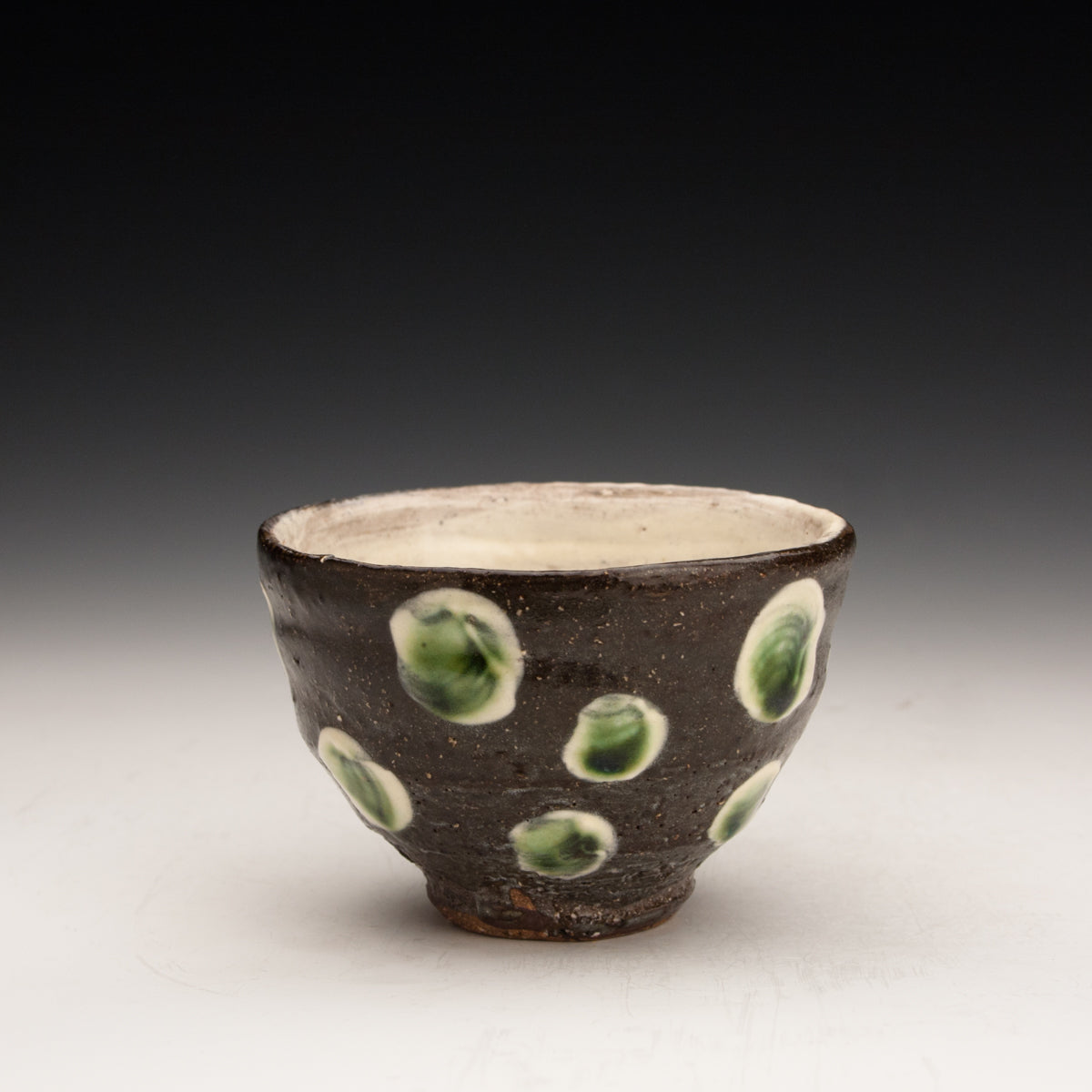 Wood fired local red clay. Iron and white slip, clear glaze, green deco. 3.5 x 2.25