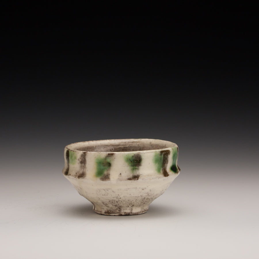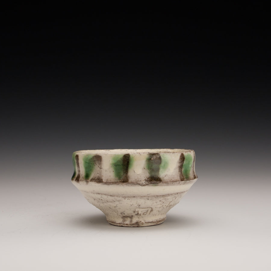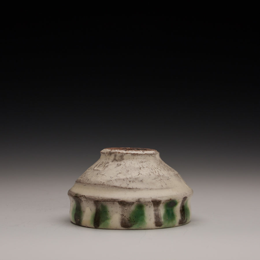 Wood fired local red clay. White slip and clear glaze with copper green. 2 x 3.25