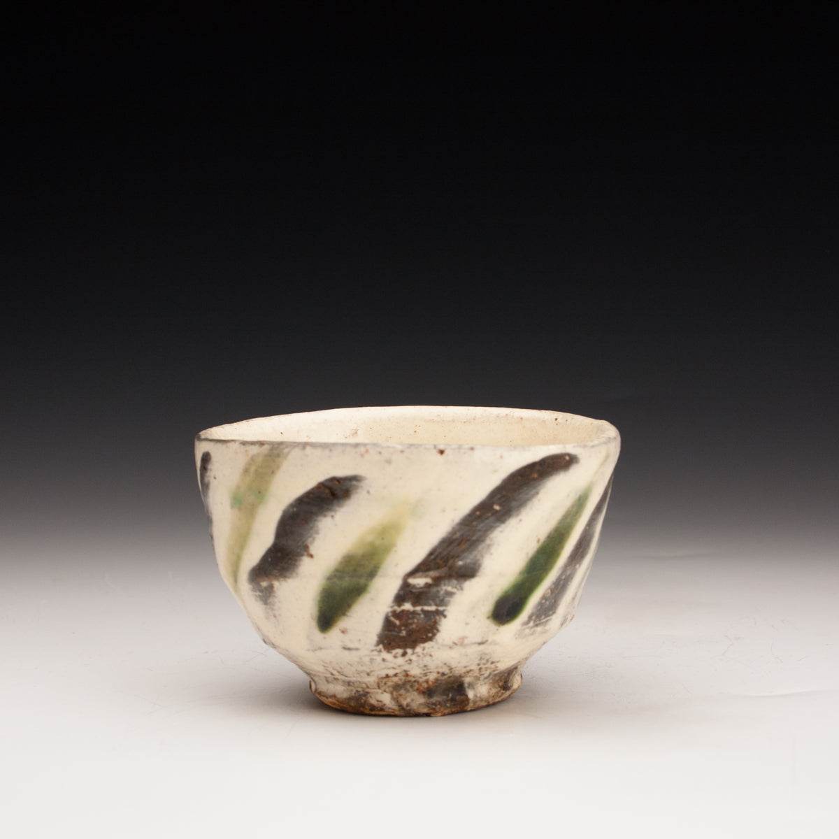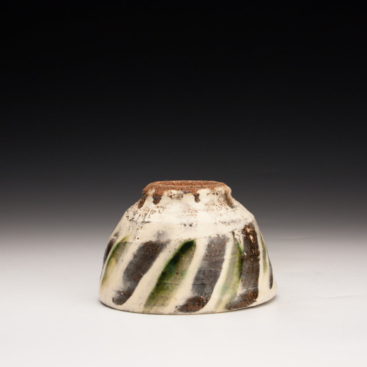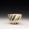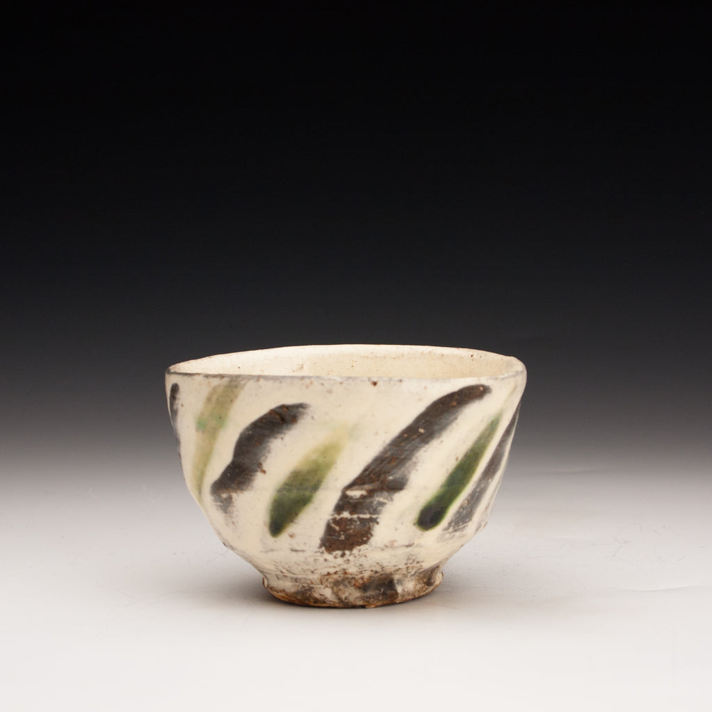 Wood fired local red clay. White slip, finger wipes and clear glaze with green deco. 3.5 x 2.25