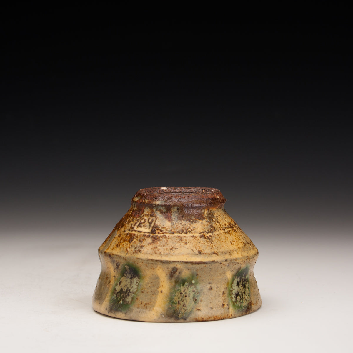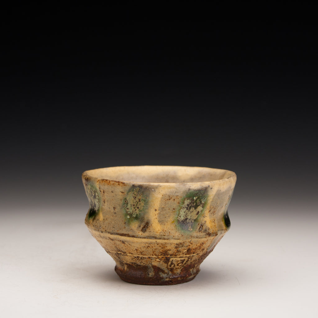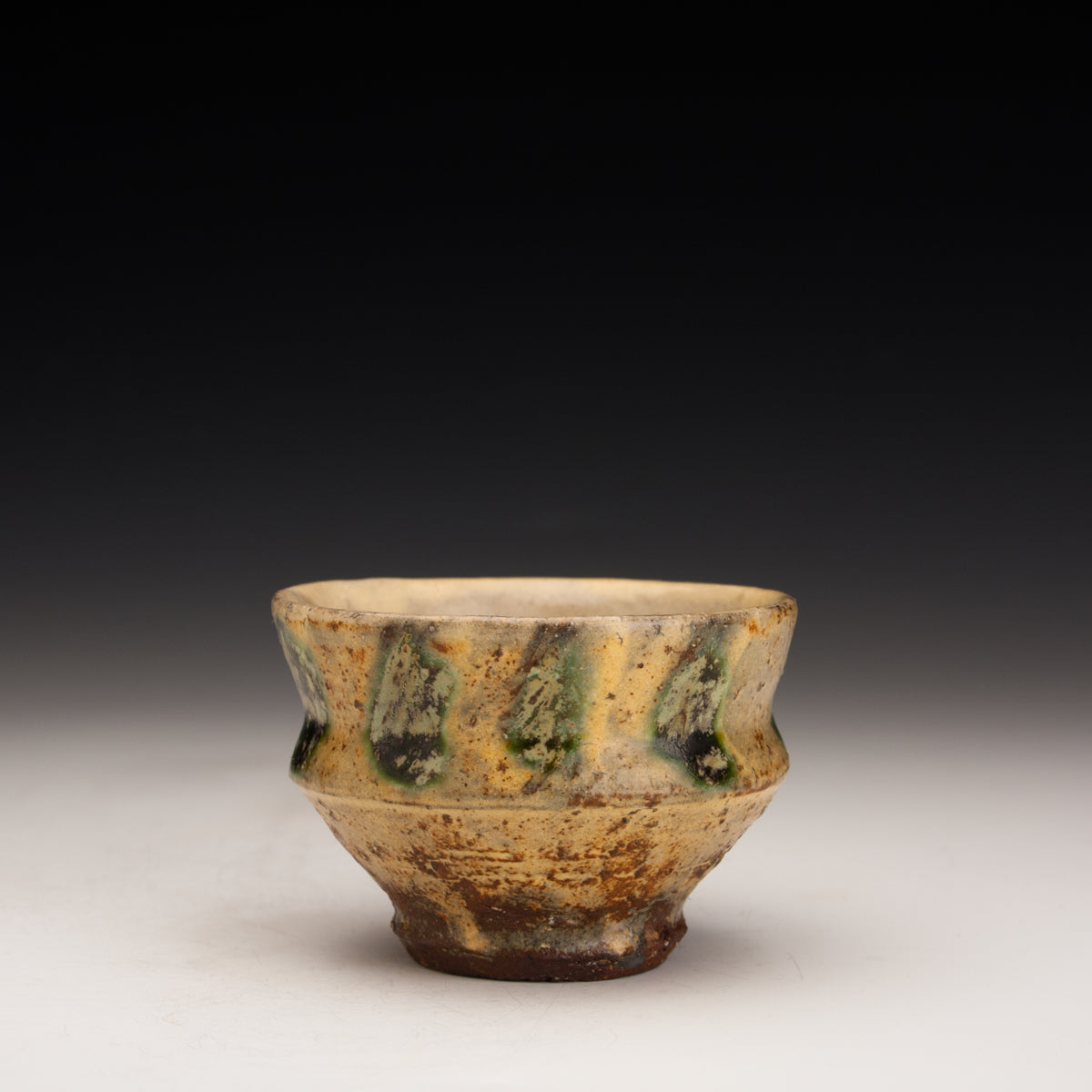 Wood fired local red clay. Yellow glaze with green stripes. 3.5 x 2.5