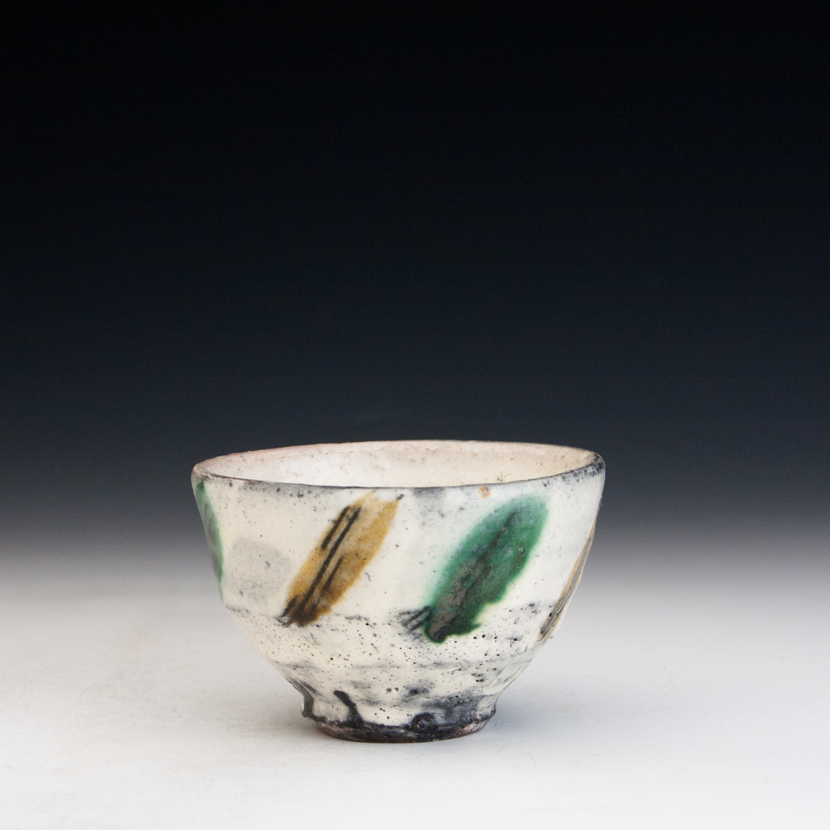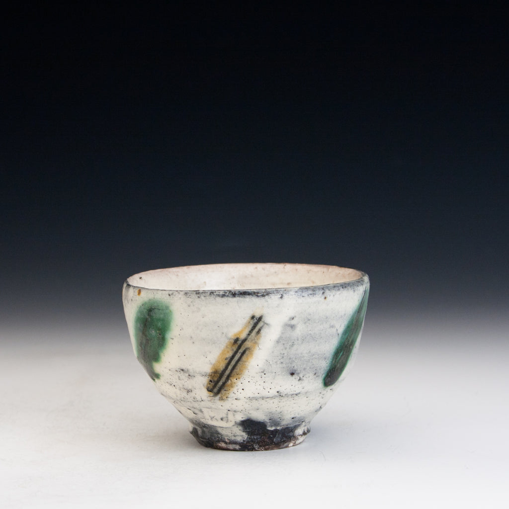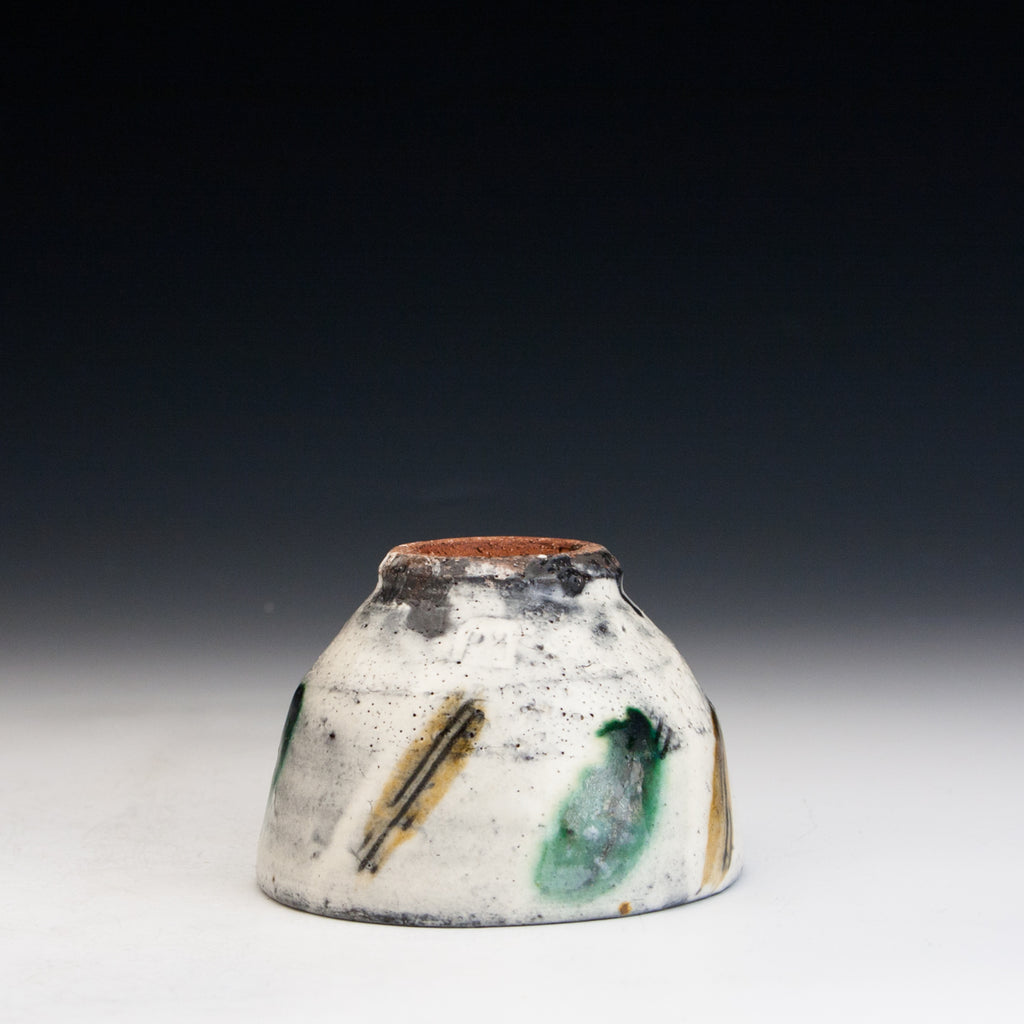 Wood fired local red clay. White slip, sgraffito and clear glaze with green and amber. 3.5 x 2.25
