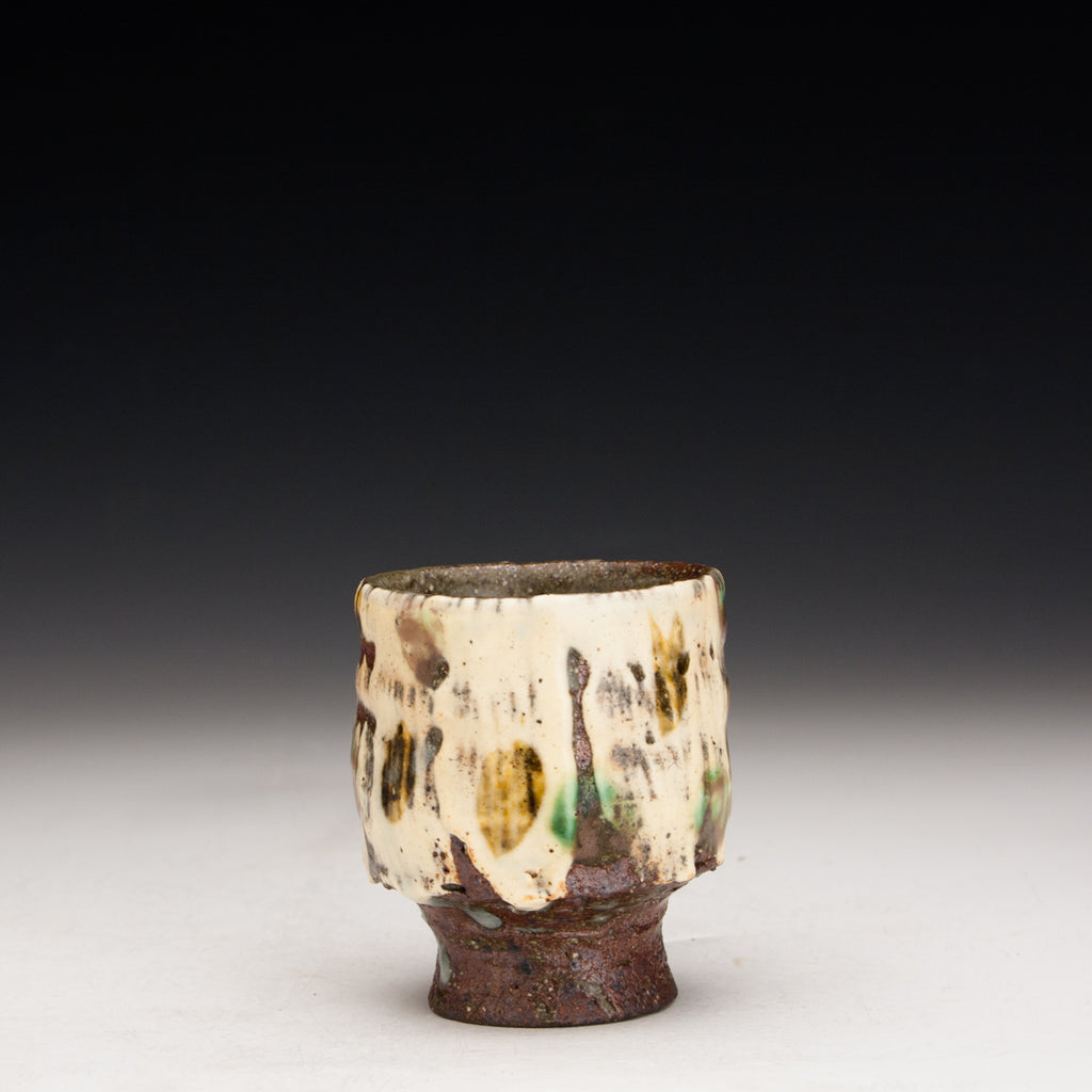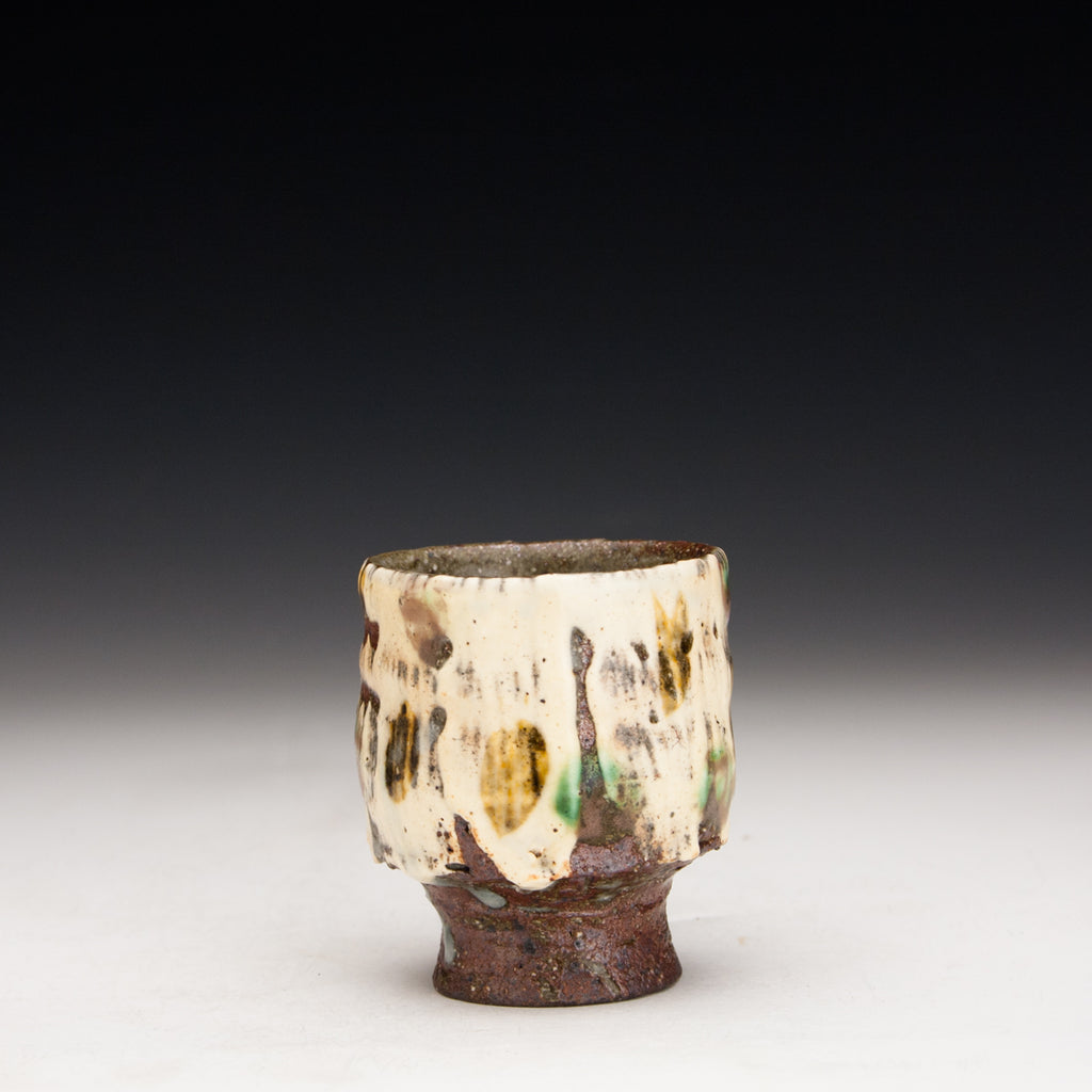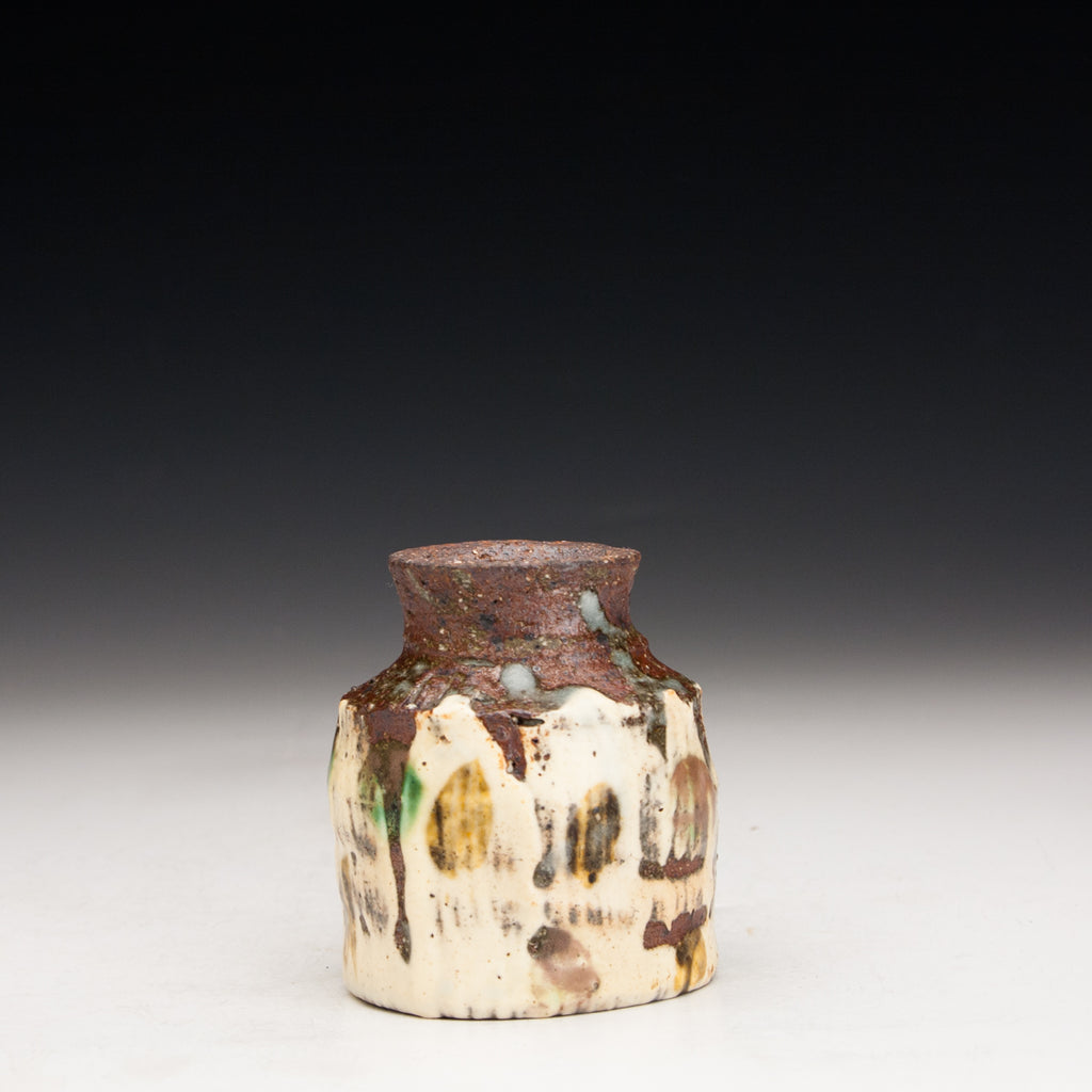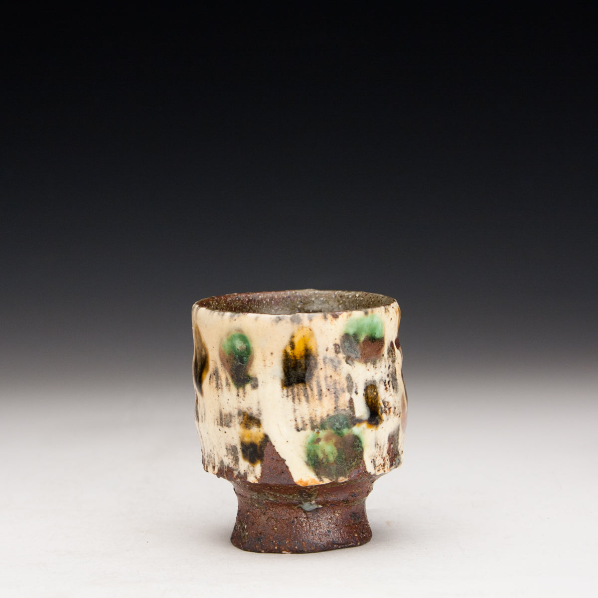 Local red clay. brushed slip and clear glaze with green and amber deco. 2.25 x 2.75