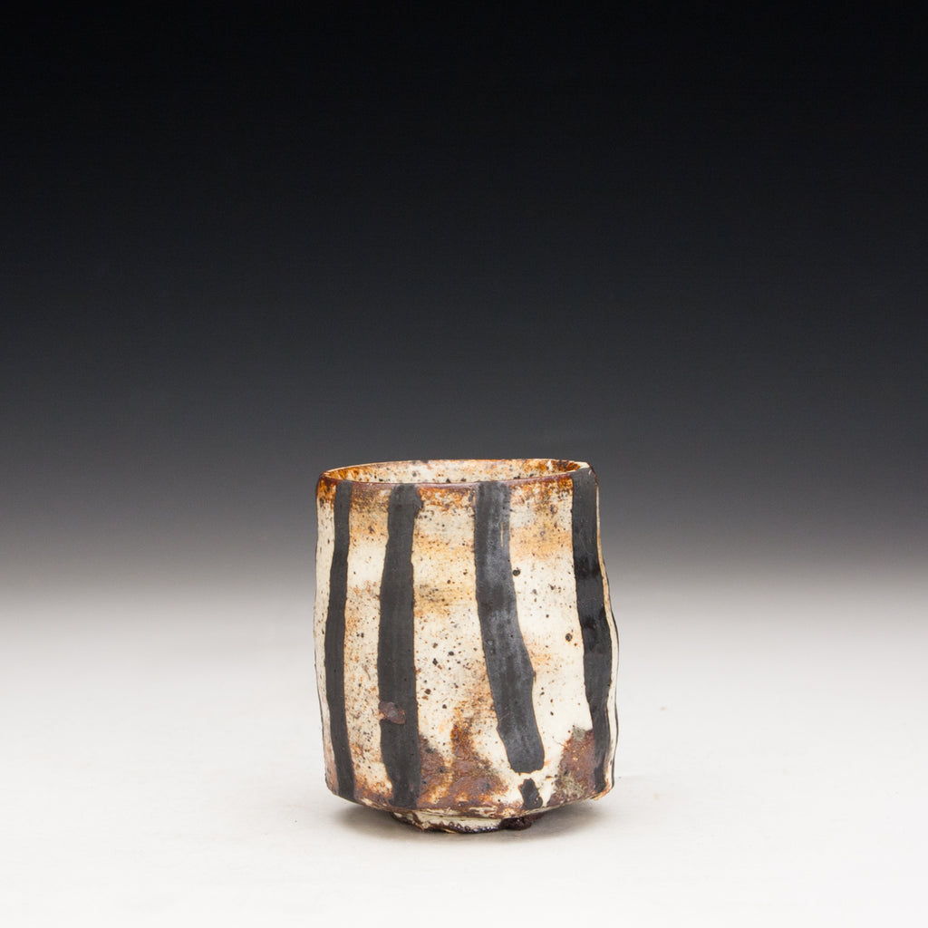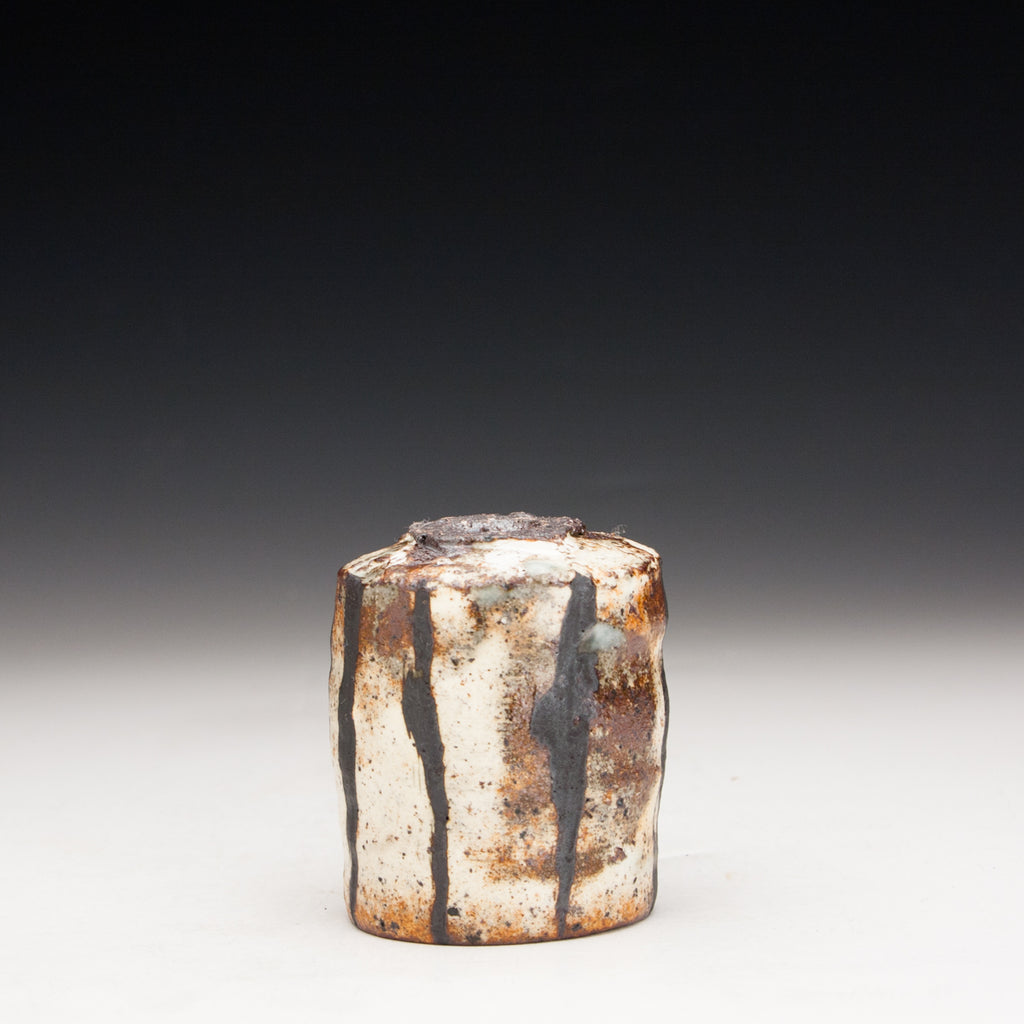Local red clay. White slip and punchong glaze with black deco. 2 x 2.25