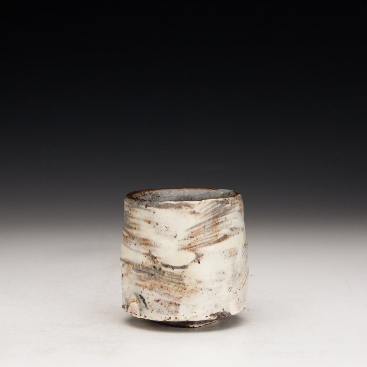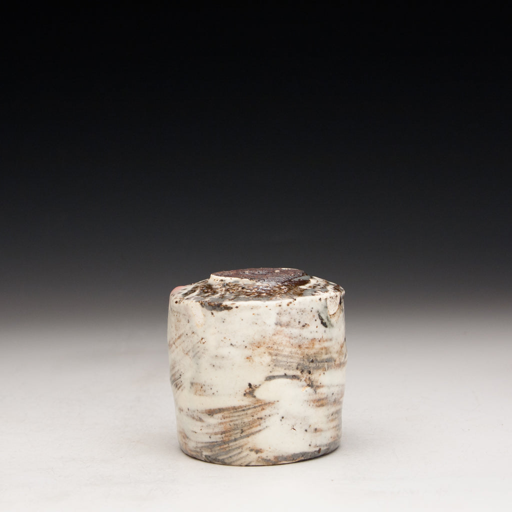 Local red clay. brushed slip and punchong glaze with black deco. 2.25 x 2.25