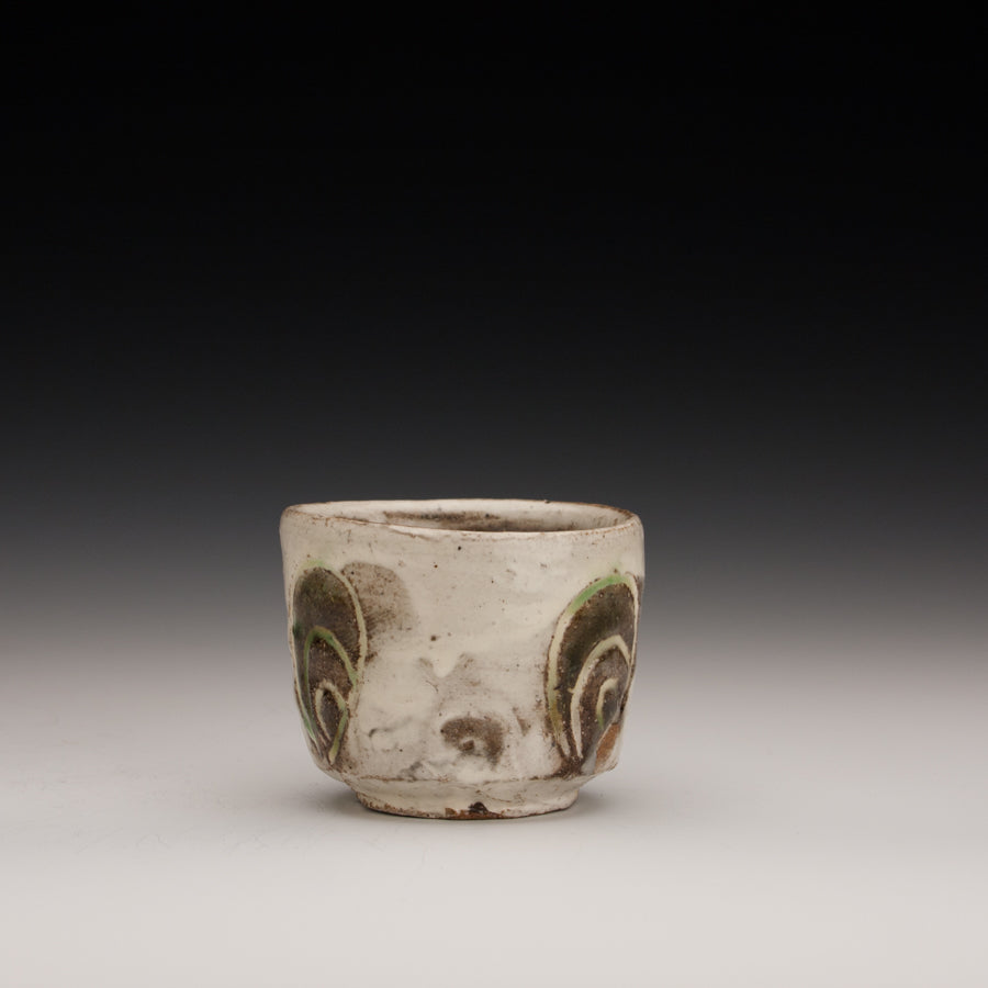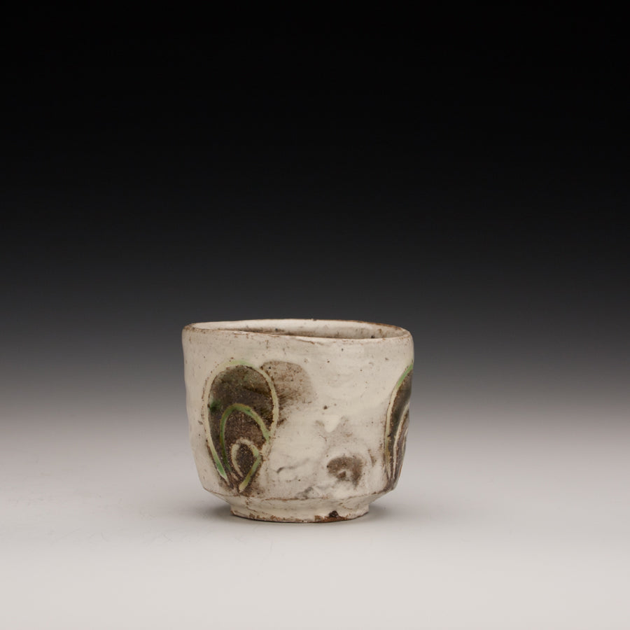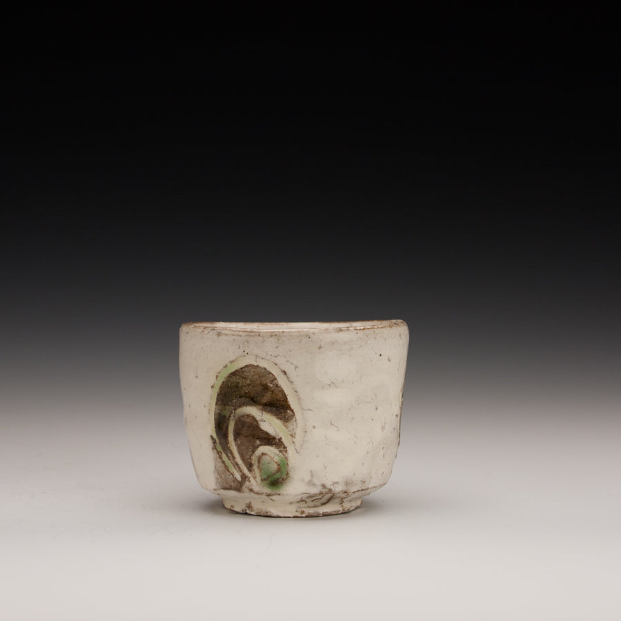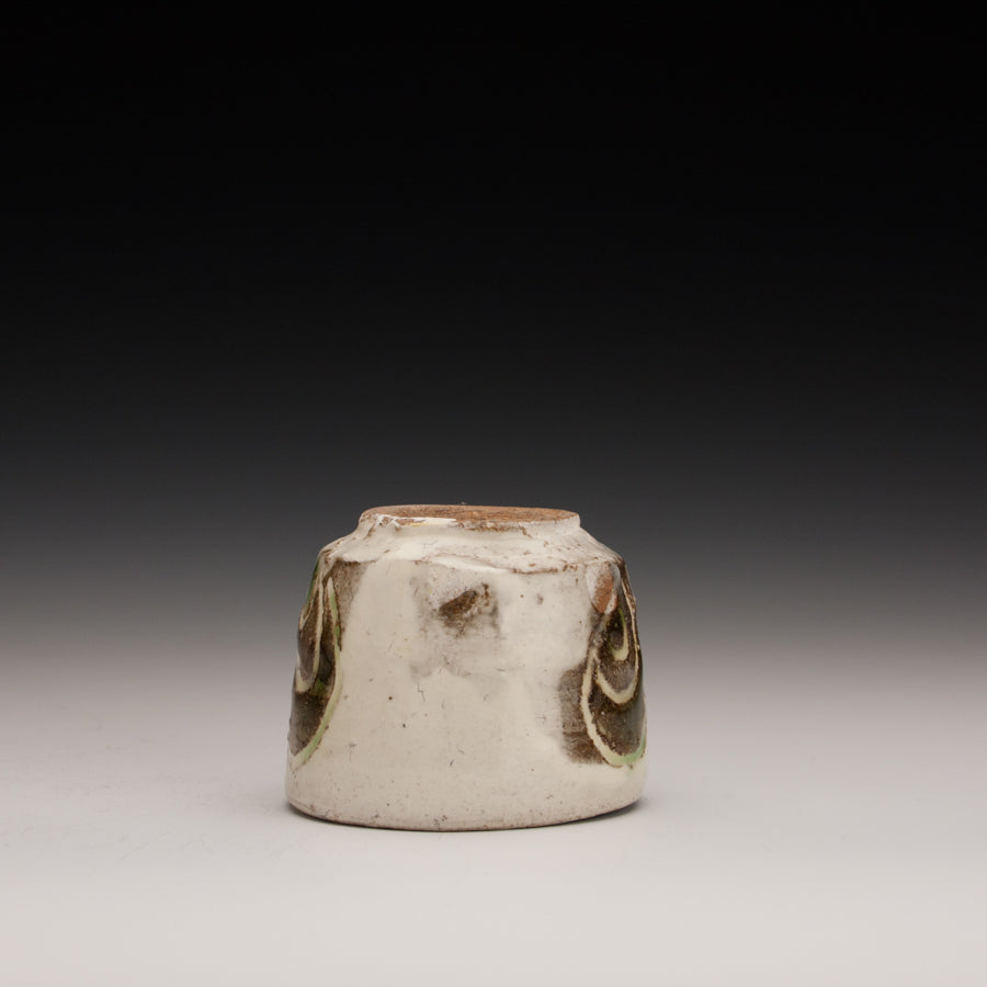 Wood fired local red clay. White slip and clear glaze with copper green. 2.25 x 2.5