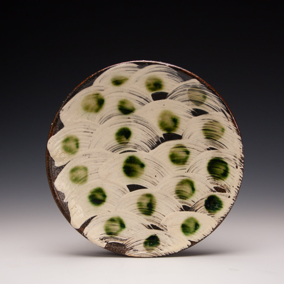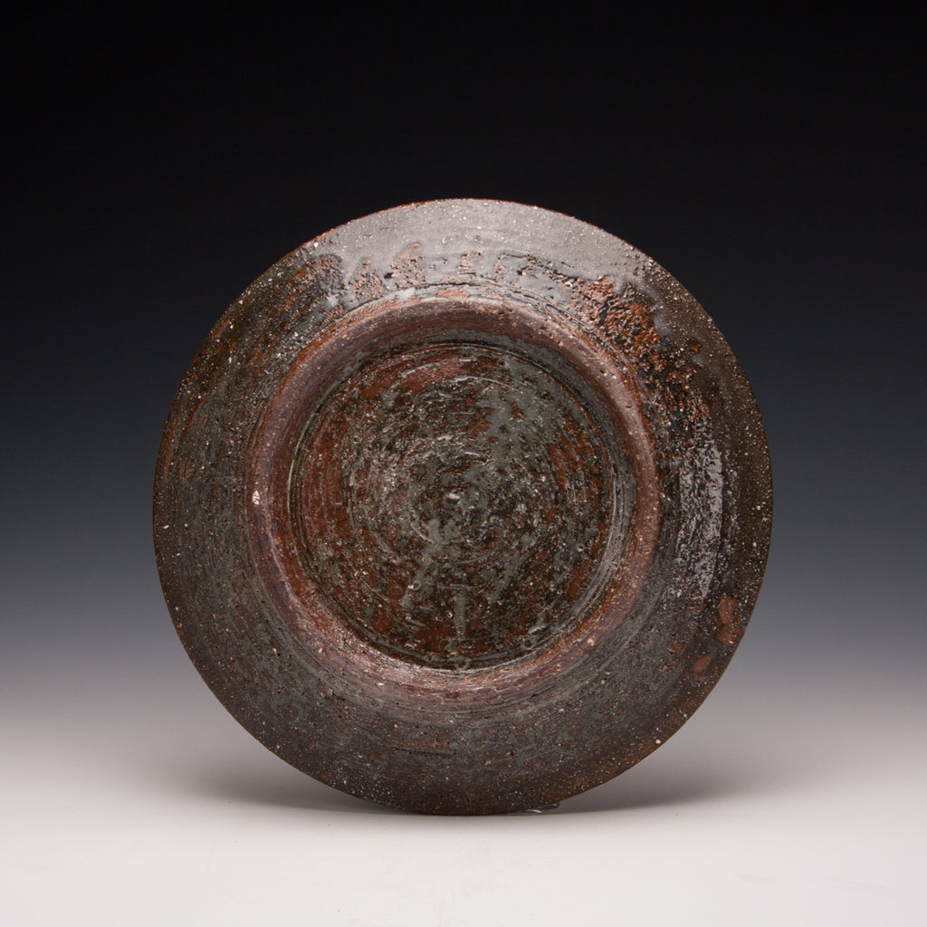Wood fired local red clay.  Hakame slip and clear glaze.  10.25 x 1.25