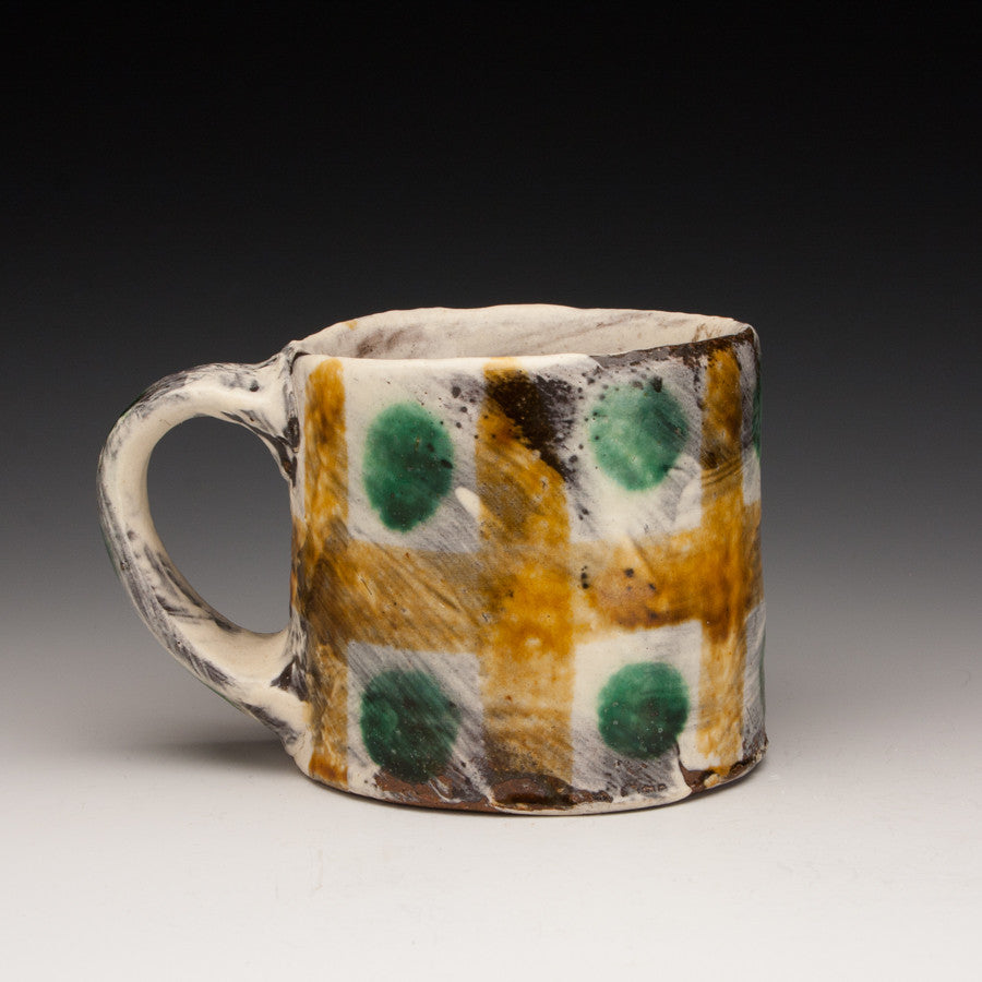 Wood fired local red clay. Hakame slip, clear glaze, and green and amber. 5 x 3.5 x 3.5