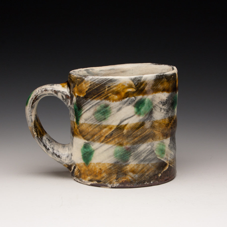 Wood fired local red clay. Hakame slip, clear glaze, and green and amber.  5 x 3.5 x 3.5