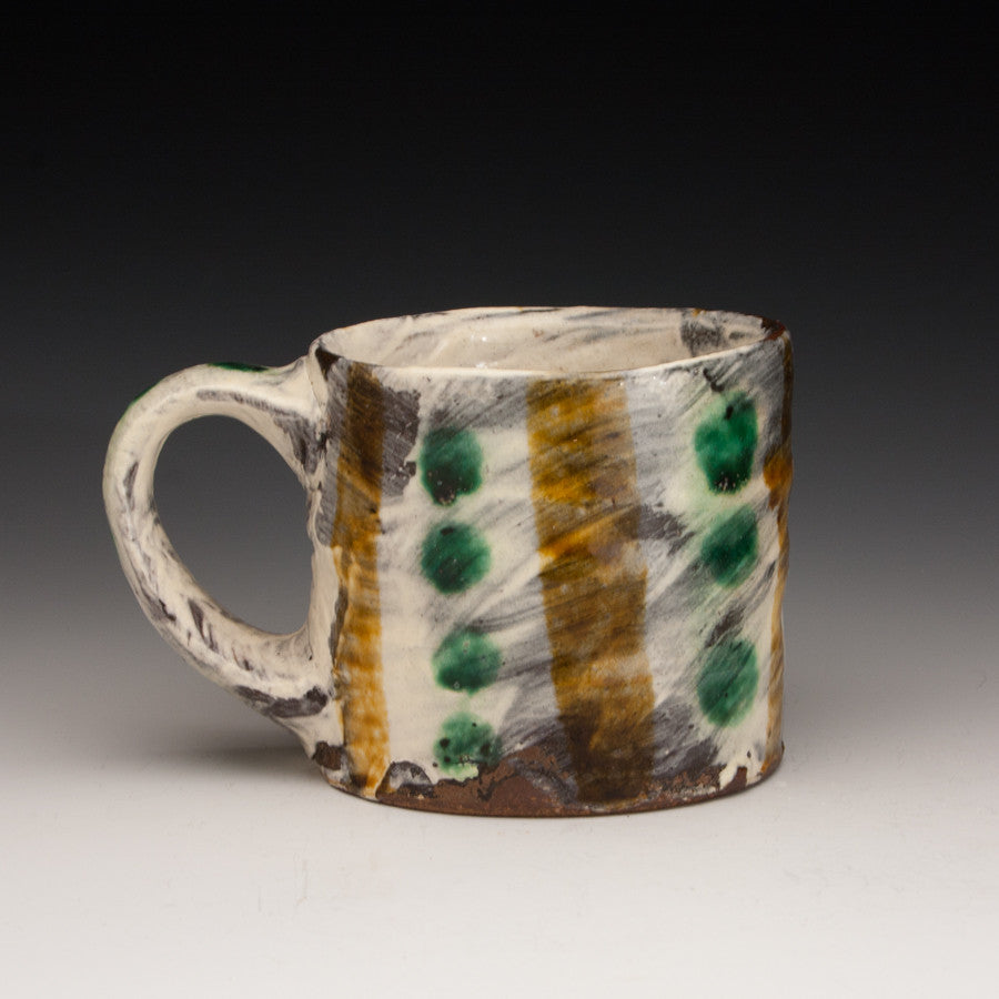 Wood fired local red clay. Hakame slip, clear glaze, and  green and amber. 5 x 3.5 x 3.5