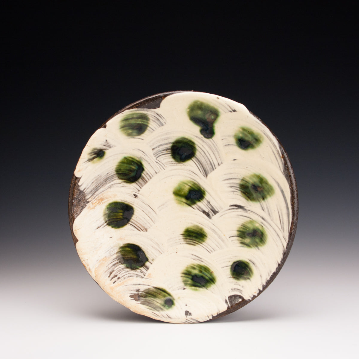 Wood fired local red clay. Hakame slip, clear glaze and green dots. 1.75 x 8 x 8.