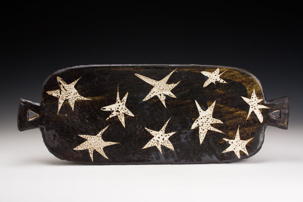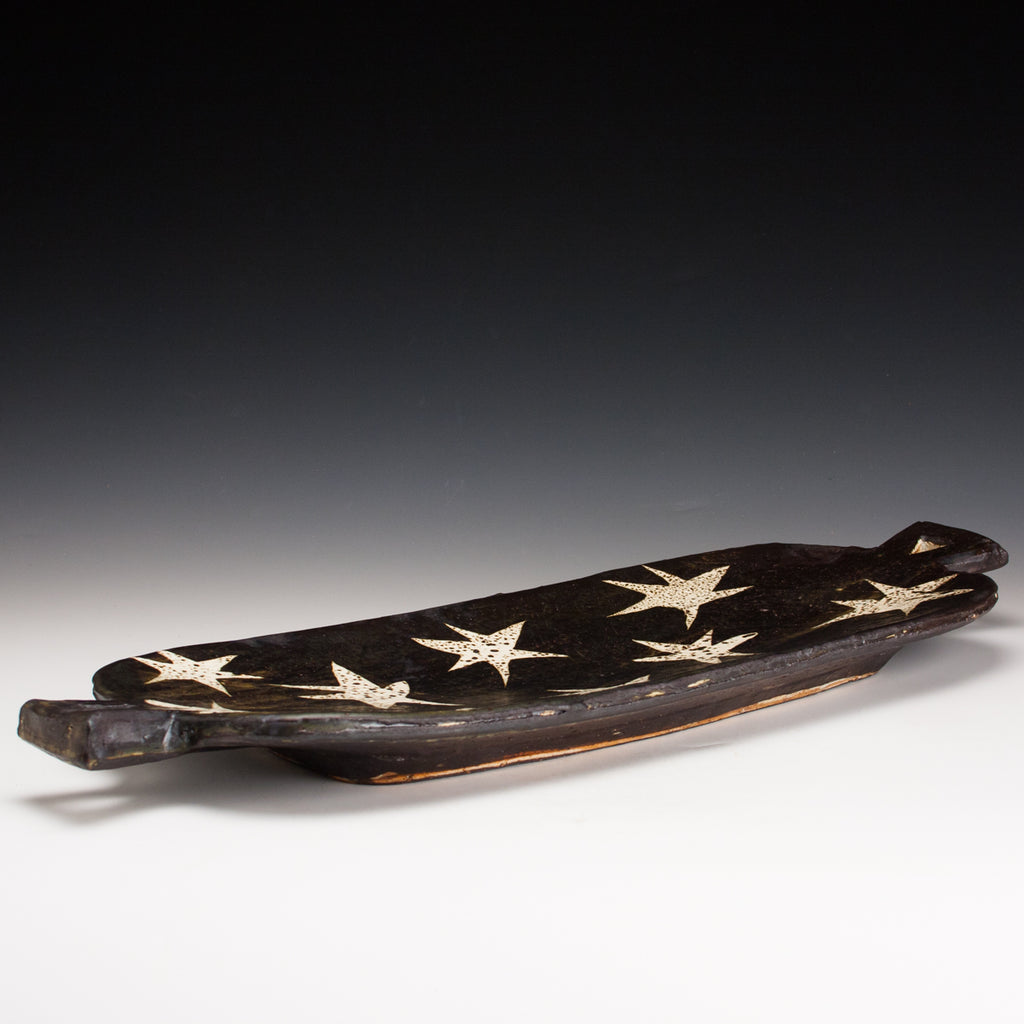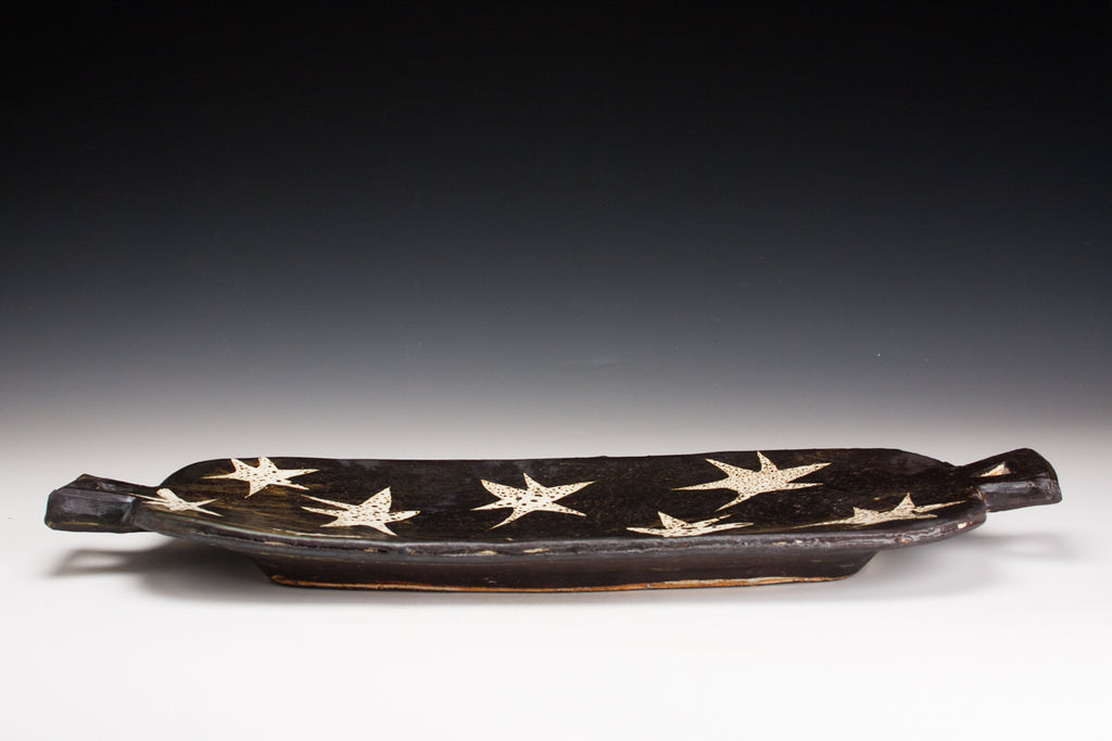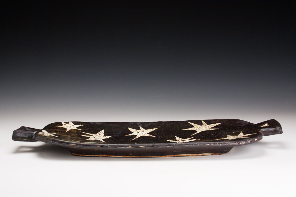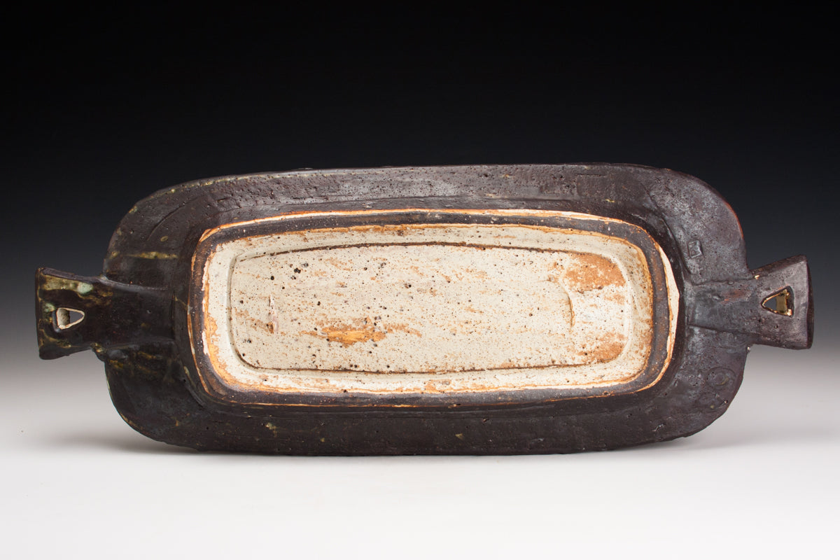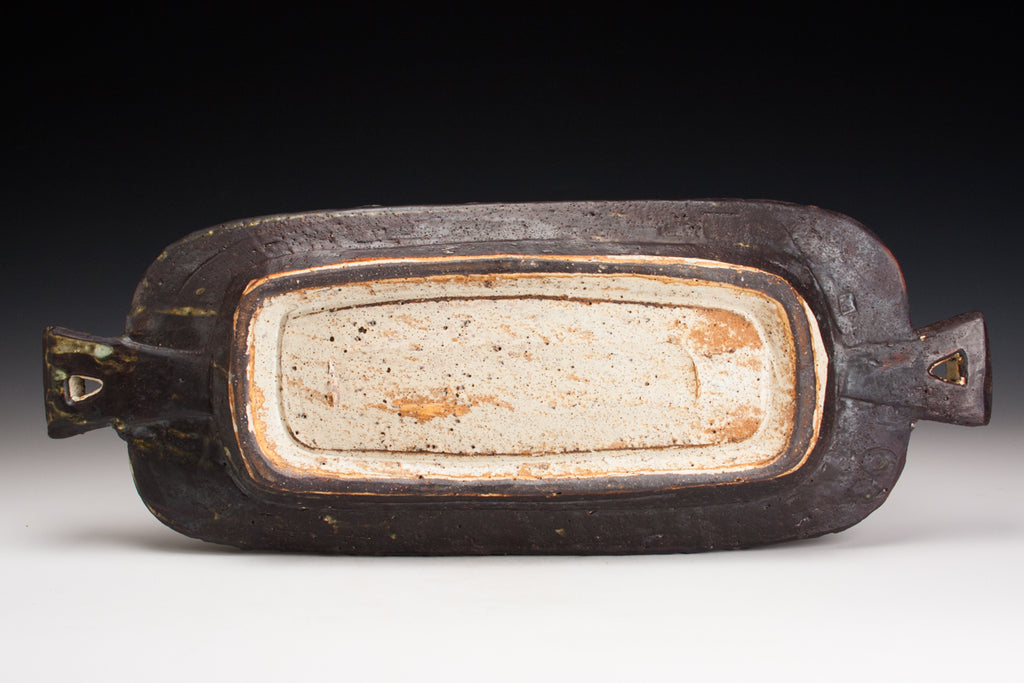 Local red clay. White slip and finger wipes, green and amber, clear glaze. 19.5 x 7 x 2