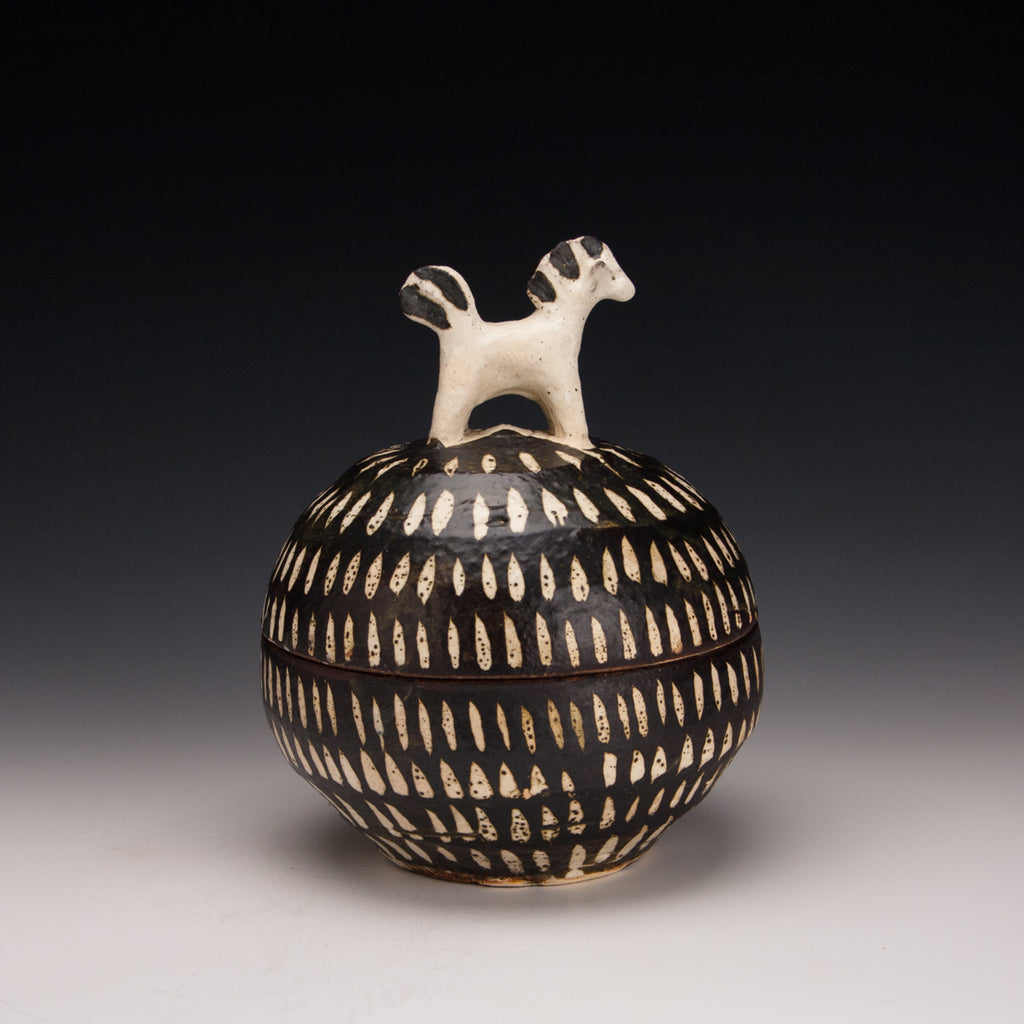 Wood fired local red clay. Wax resist and iron deco. 6.25 x 5.5
