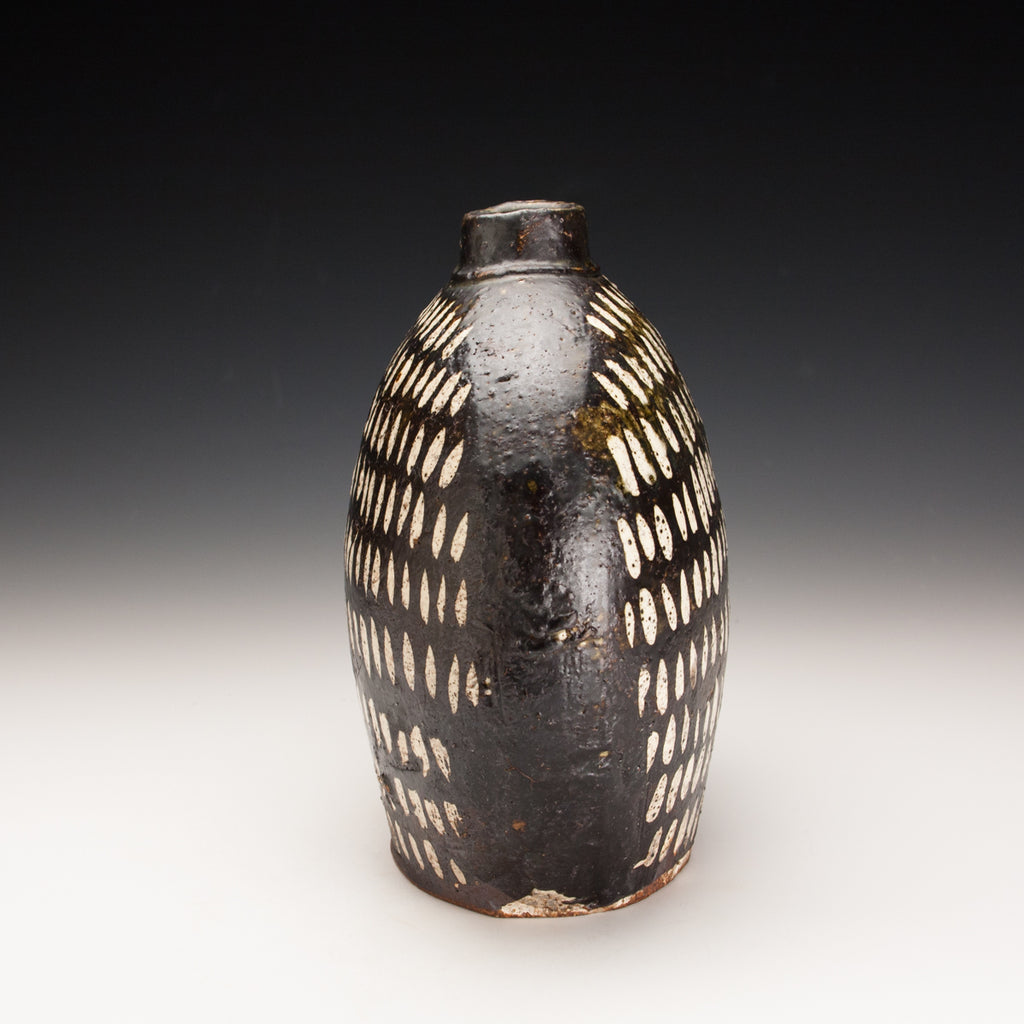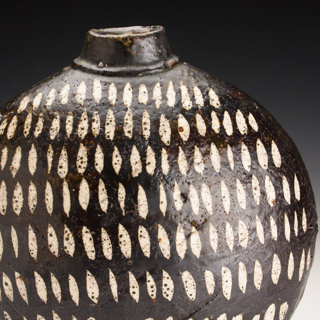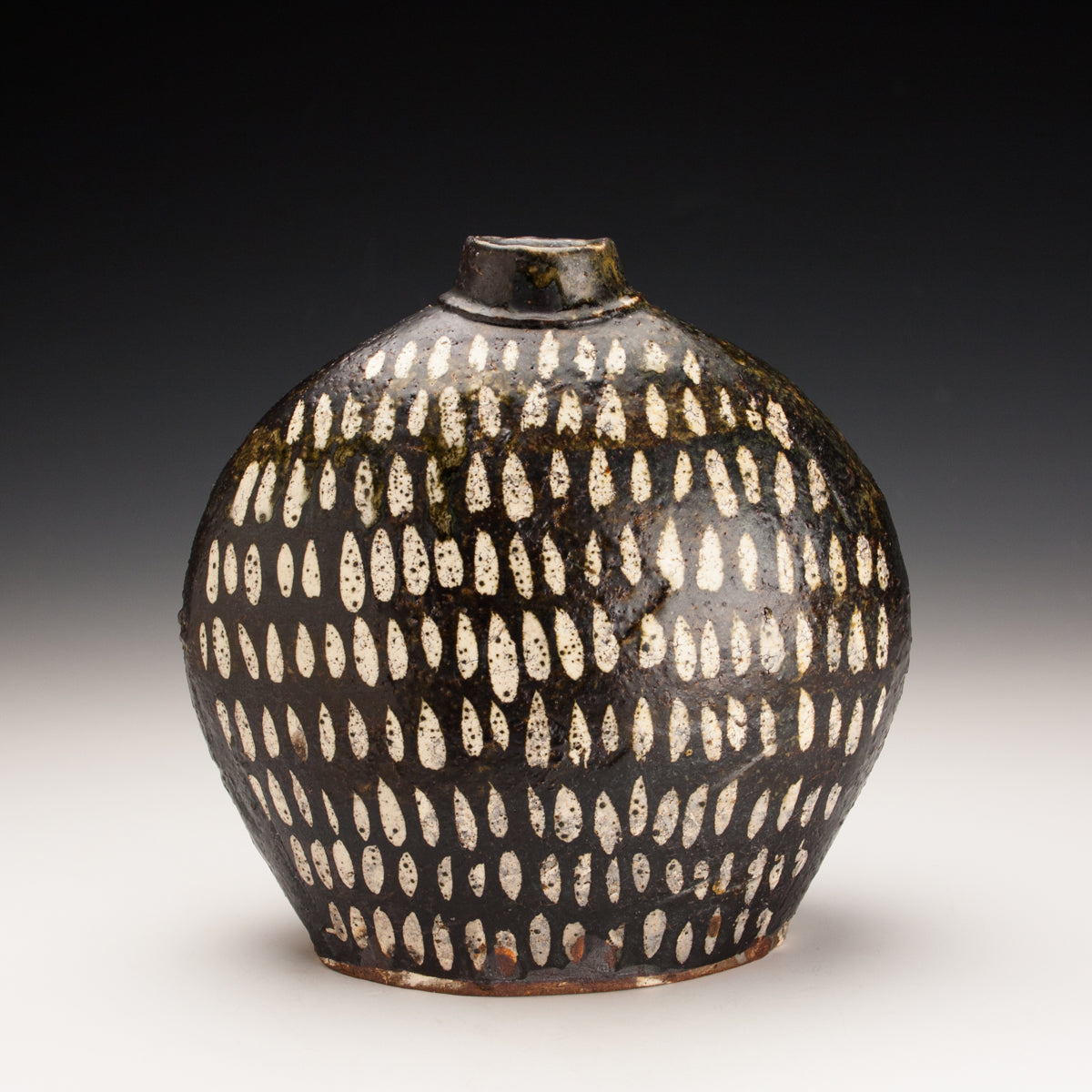 Wood fired local red clay. Wax resist and iron deco. 8.5" x 8" x 4.5"