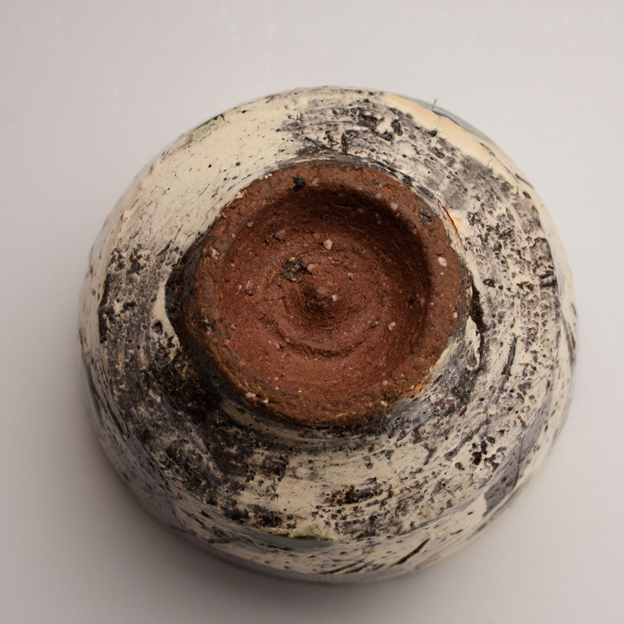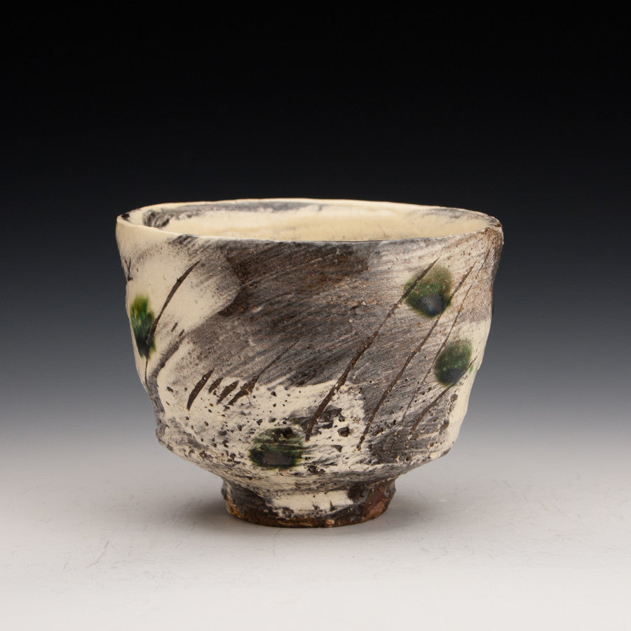 Wood fired local red clay. Kohiki slip, green dots and Clear glaze. 4 x 3.25
