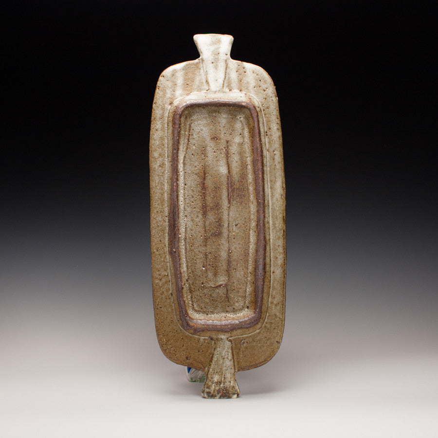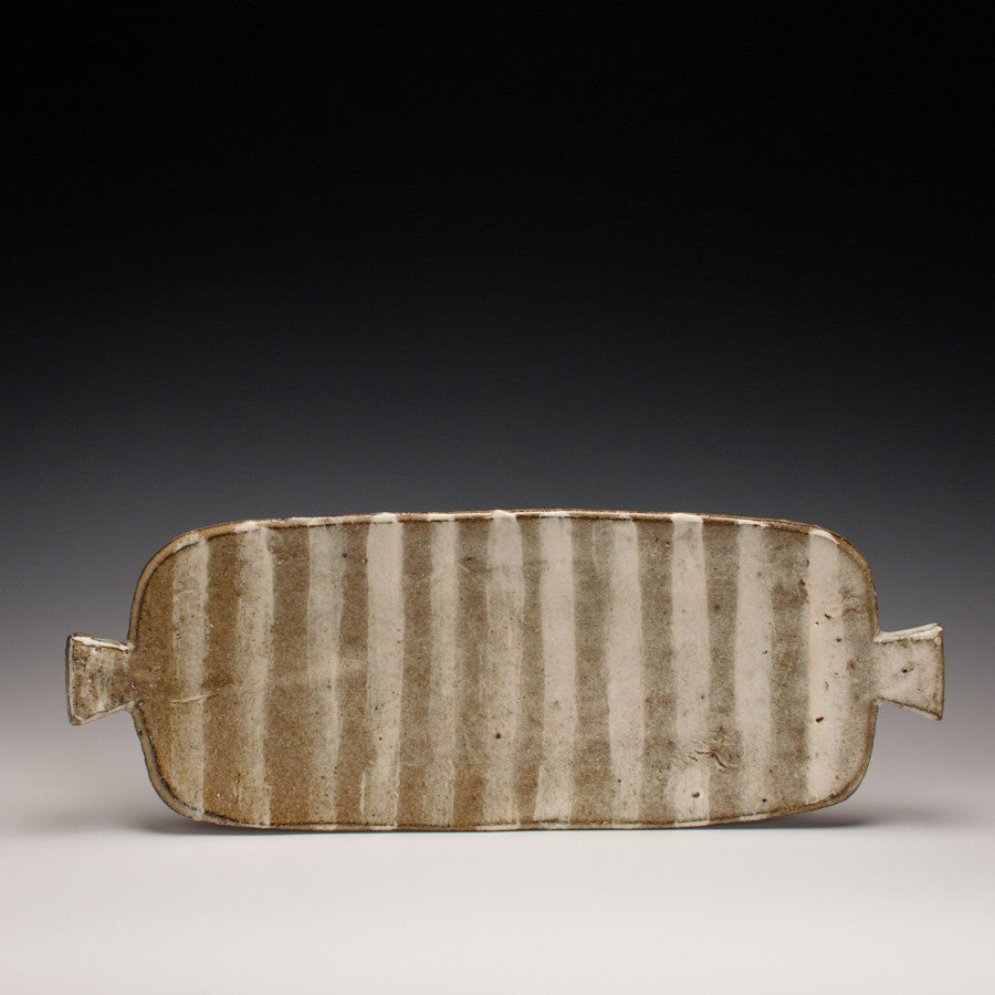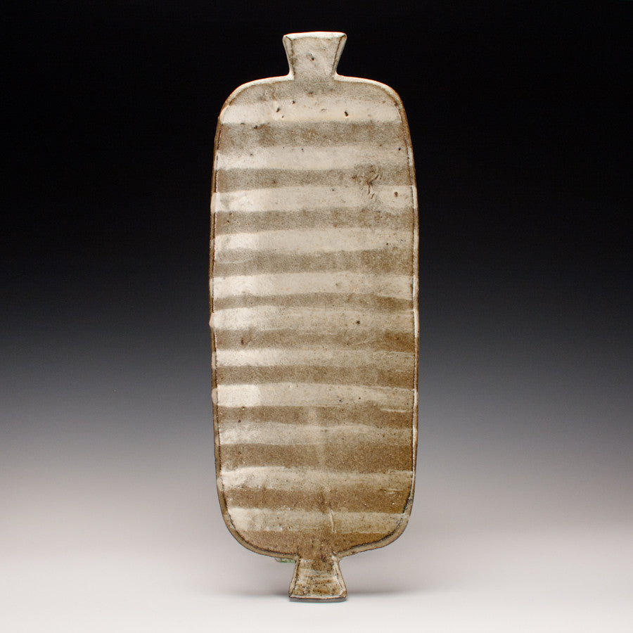 Wood fired local red clay. White slip stripes and Nuka Glaze. 19 x 7.25 x 1