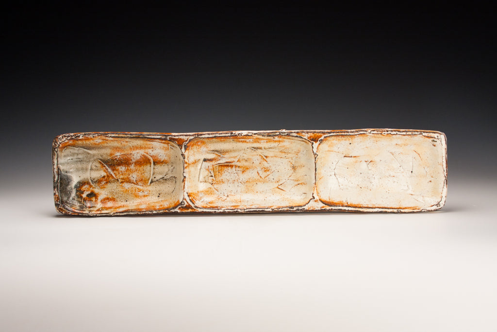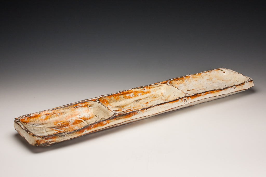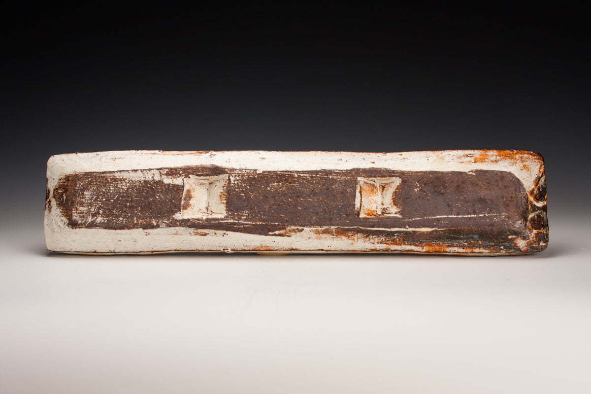 Wood fired local red clay. White slip and clear glaze. 1.75 x 20.5 x 4.25