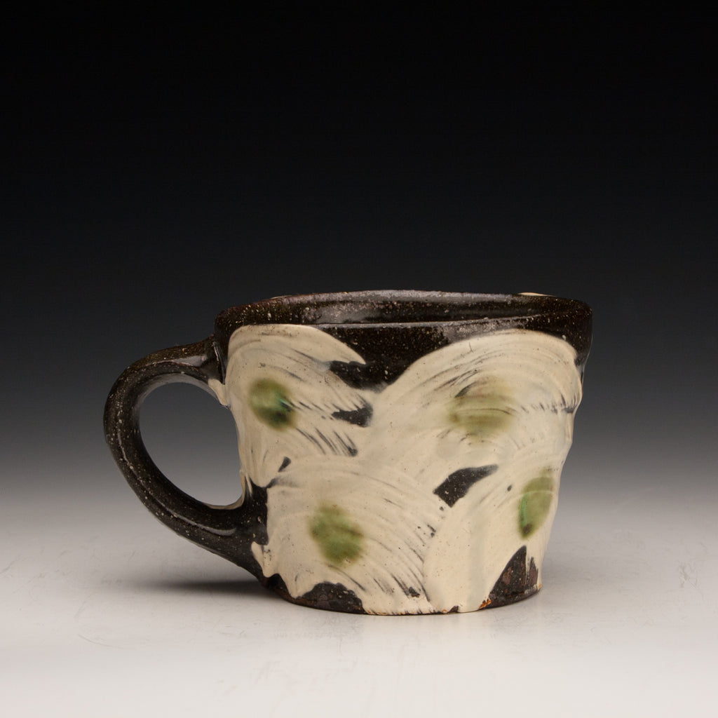 Wood fired local red clay. Hakame slip, clear glaze and green dots. 3.75 x 5.5 x 4.25