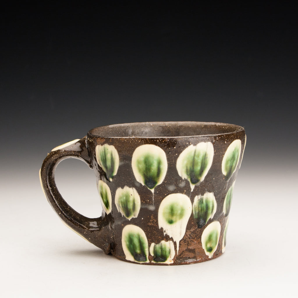 Wood fired local red clay. Brushed Slip, clear glaze and copper green.  5 x 3.25