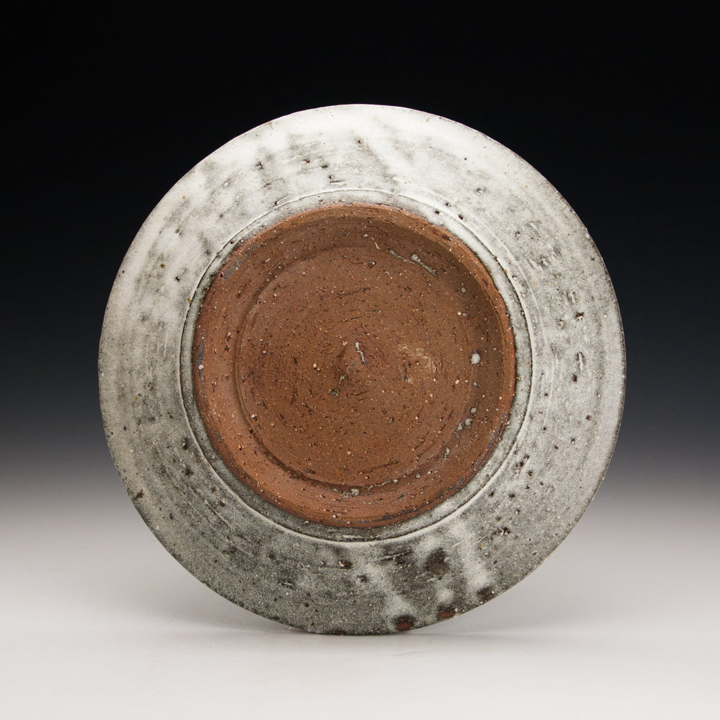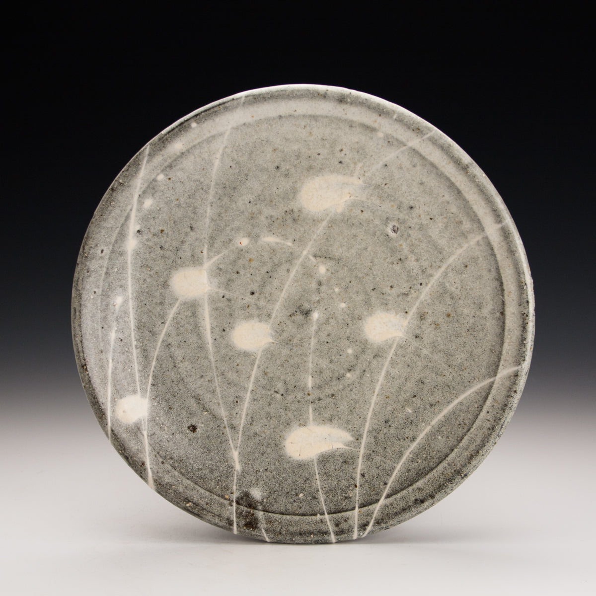 Wood fired local red clay. White slip trailing and Nuka glaze. 10.75 x 1.75