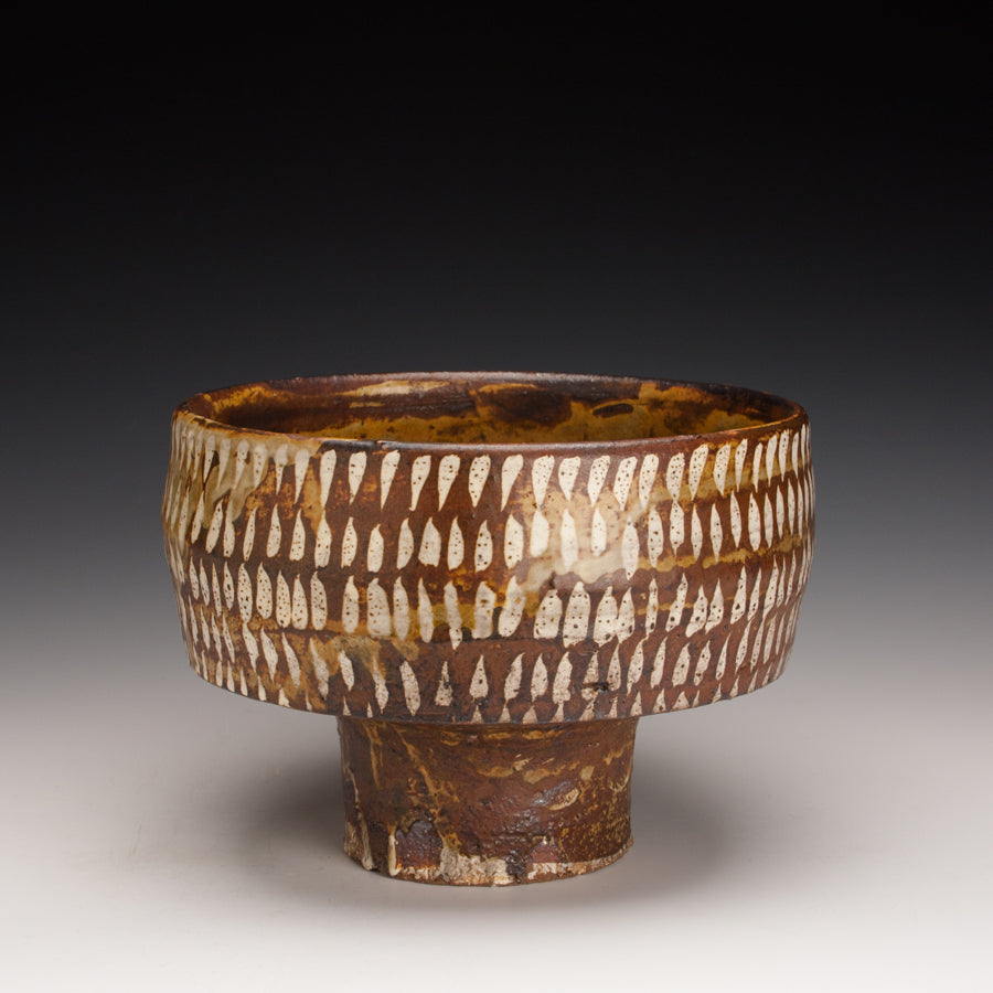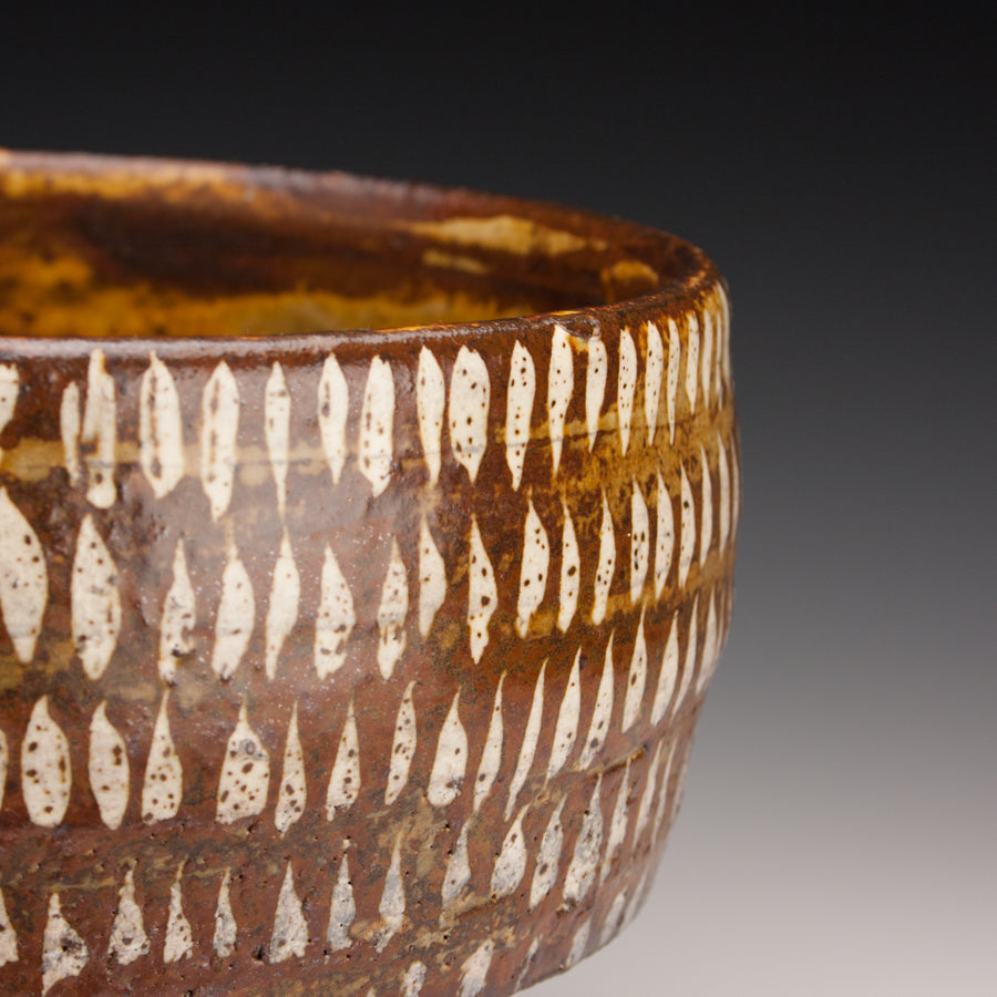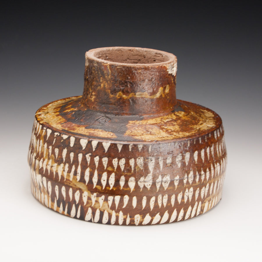 Wood fired local red clay. Wax resist and iron wash. 5.5 x 8 x 8