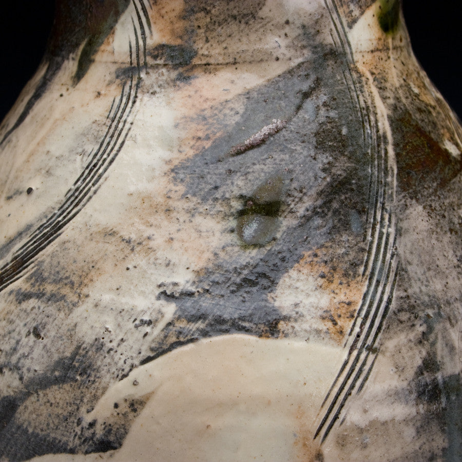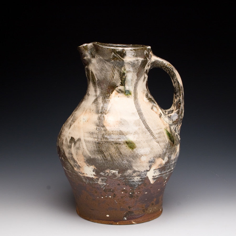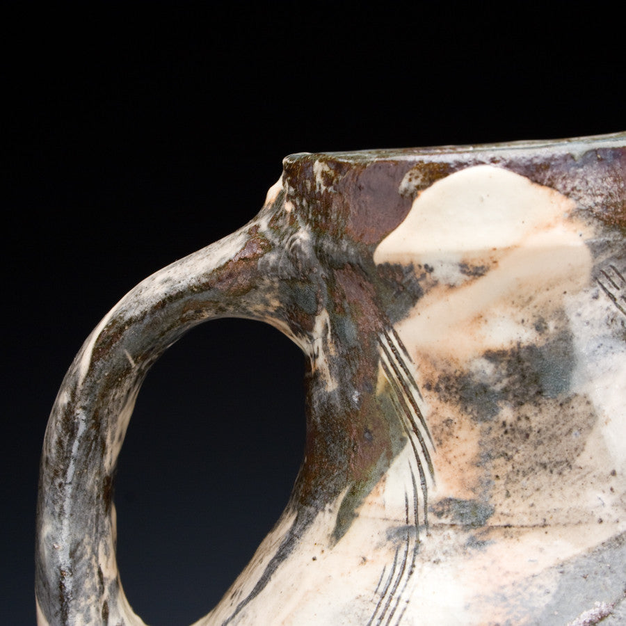 Wood fired local red clay. White slip and oribe green under clear glaze. 11 x 7 x 7