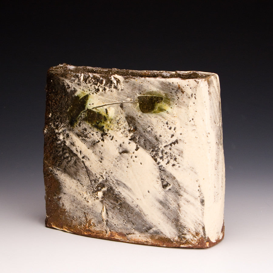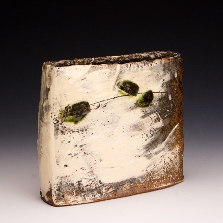 Wood fired local red clay. White slip and green under clear glaze. 6.25 x 2.5 x 6