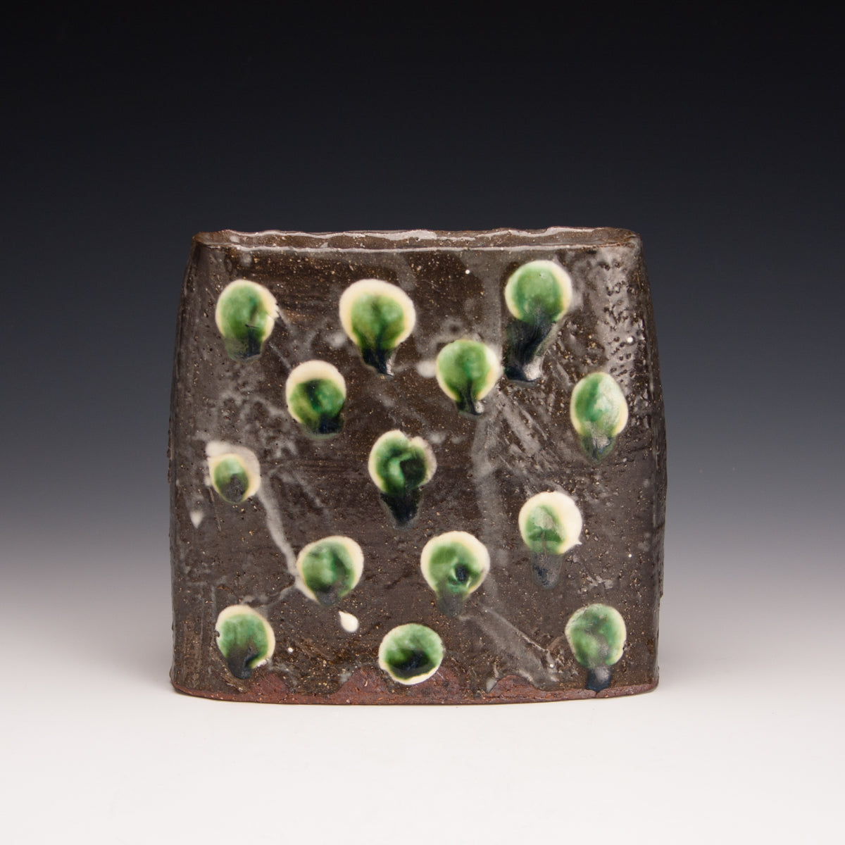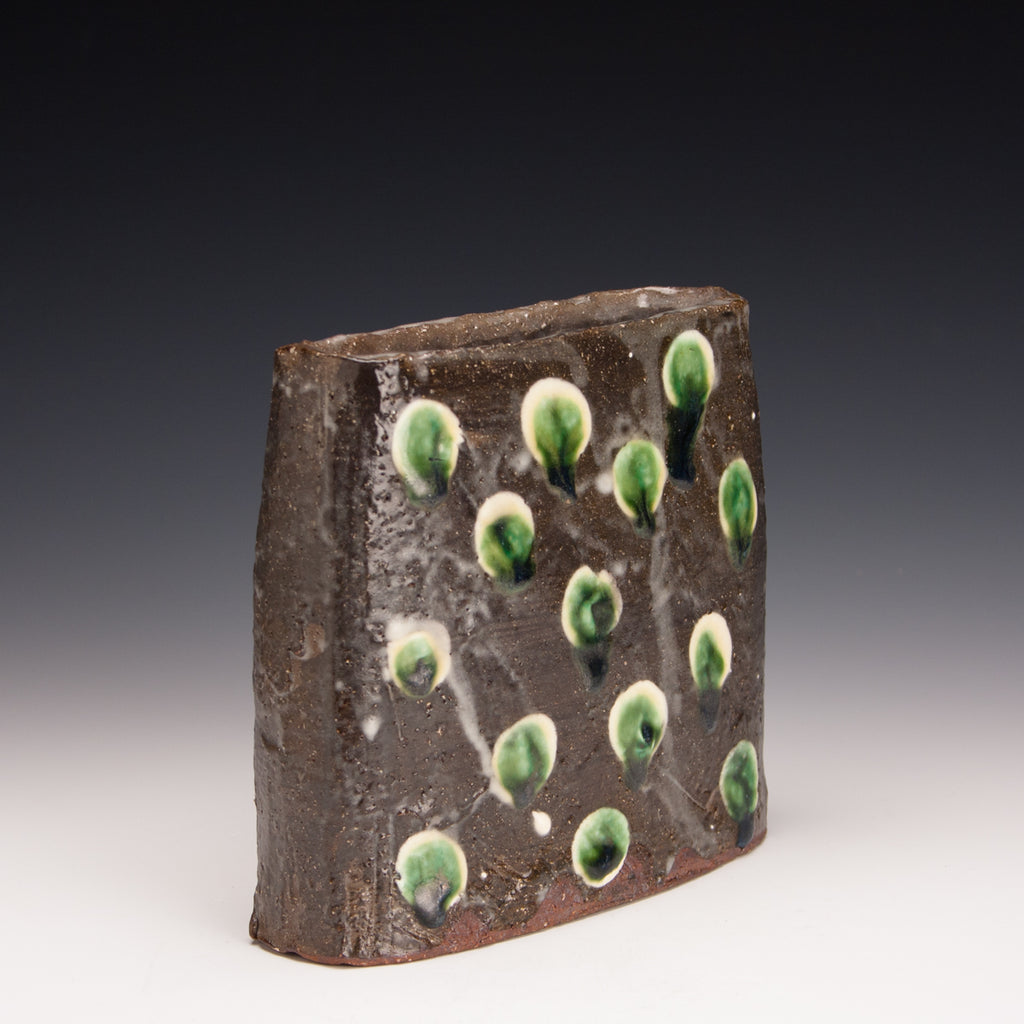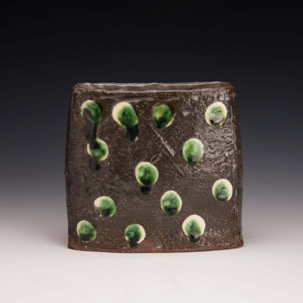 Wood fired local red clay. Iron slip, white slip, clear glaze and green deco. 5.5 x 5.5 x 1.75