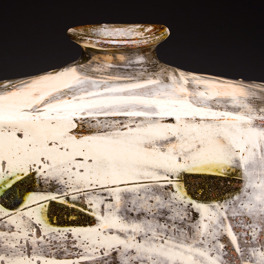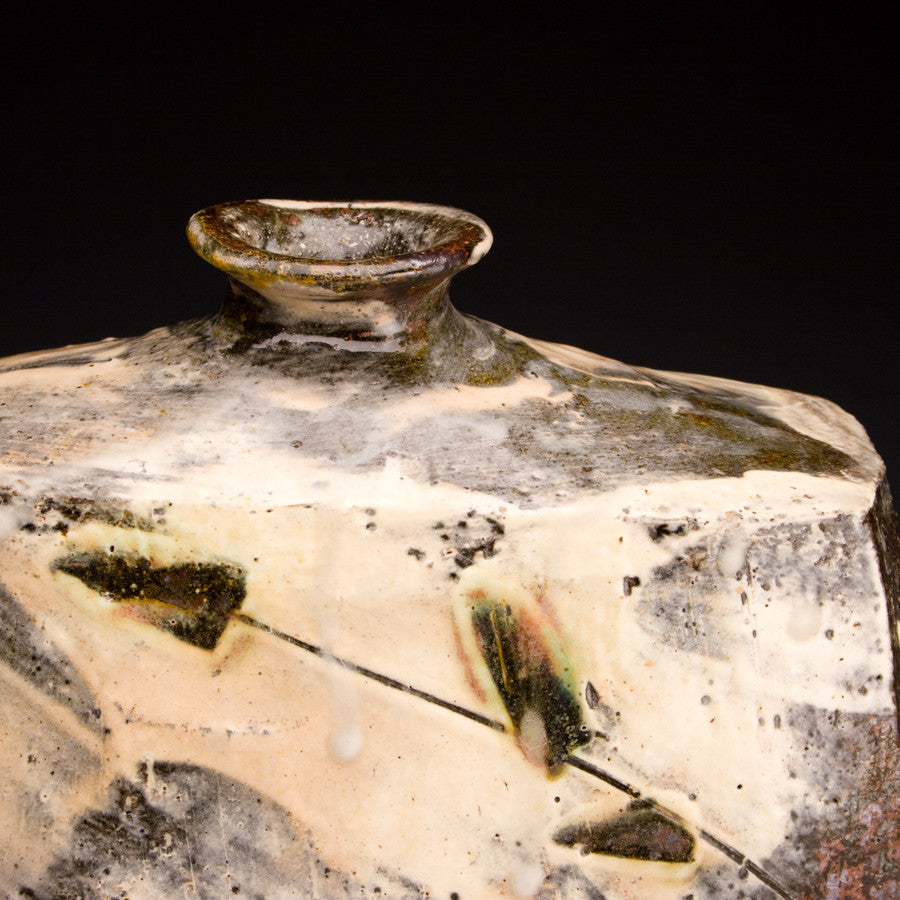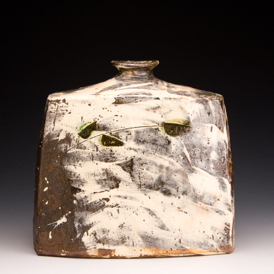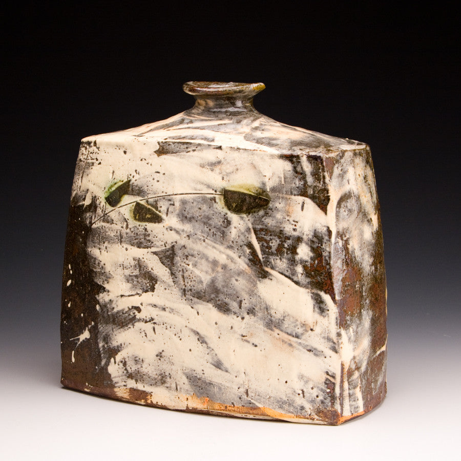 Wood fired local red clay. White slip and green under clear glaze. 8.5 x 4.25 x 9