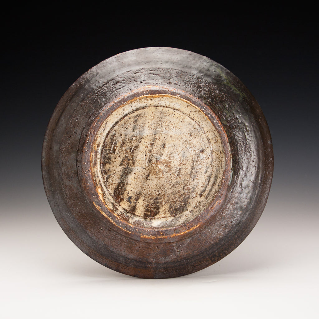 Wood fired local red clay.  Wax resist and iron stripes. 1.5 x 10.25"
