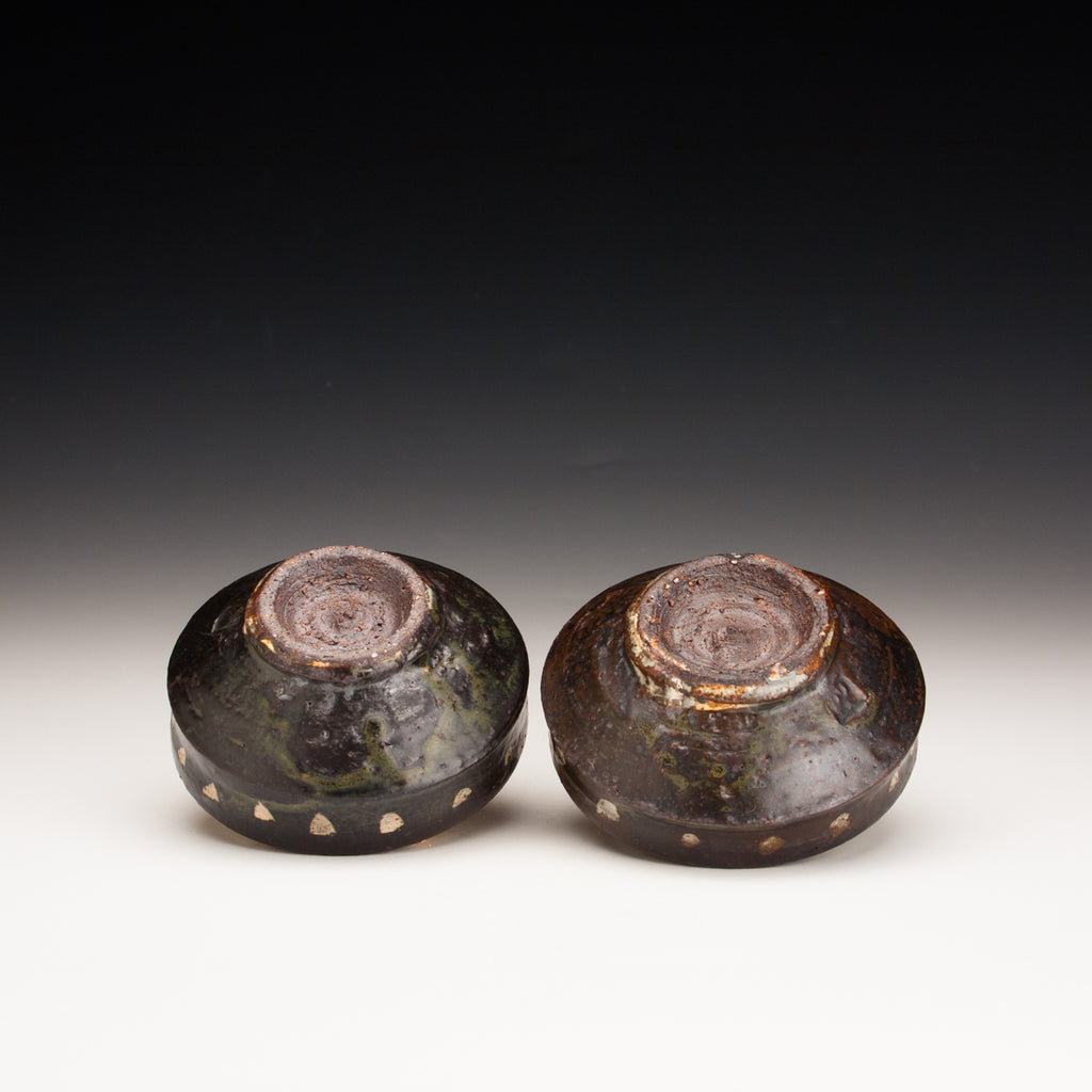 Wood fired local red clay. Wax resist and iron deco. 4 x 1.75 ea