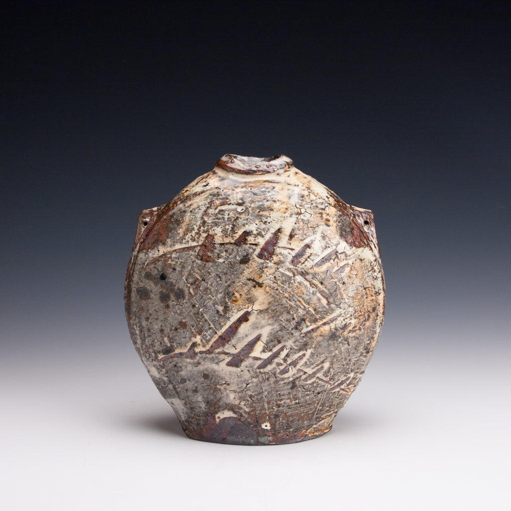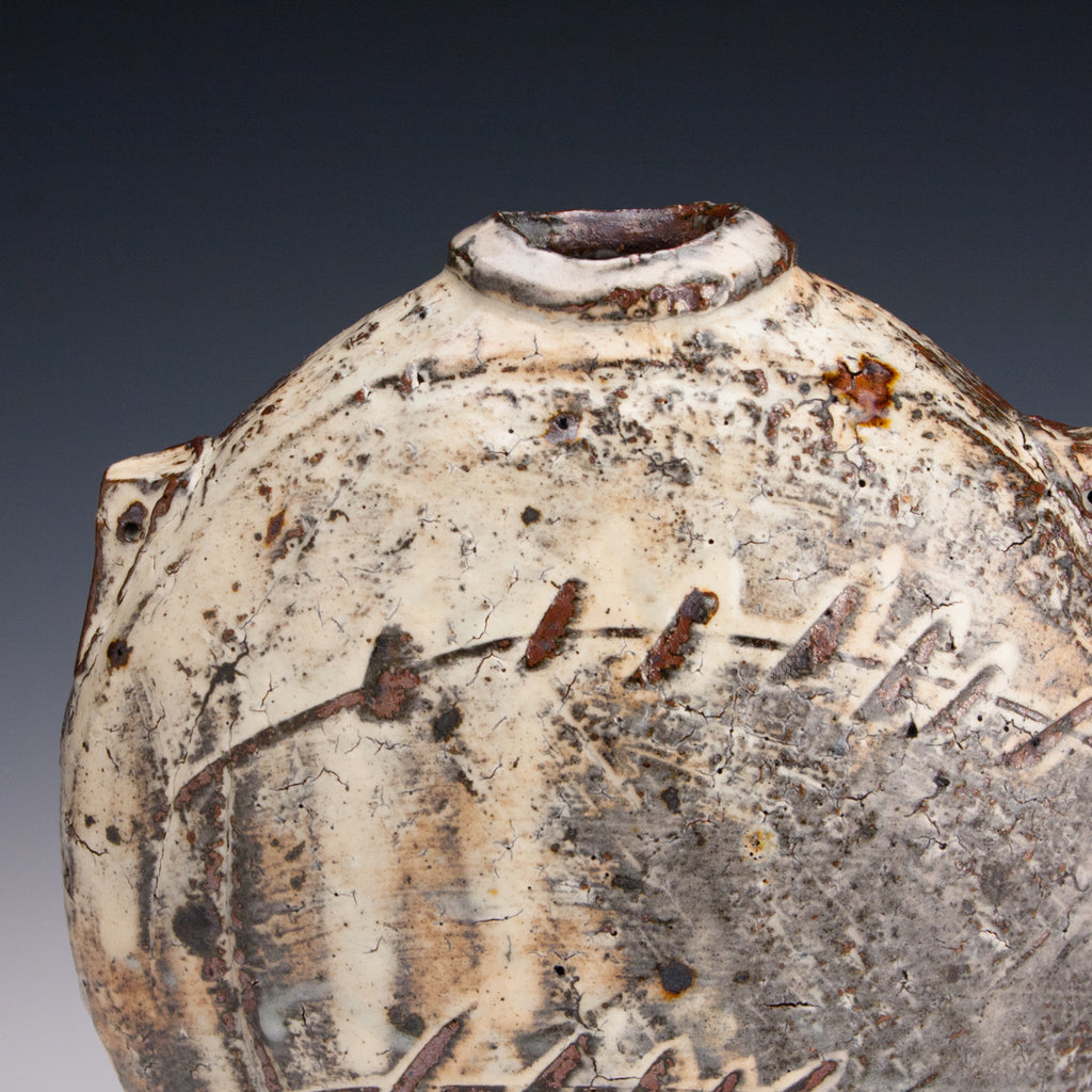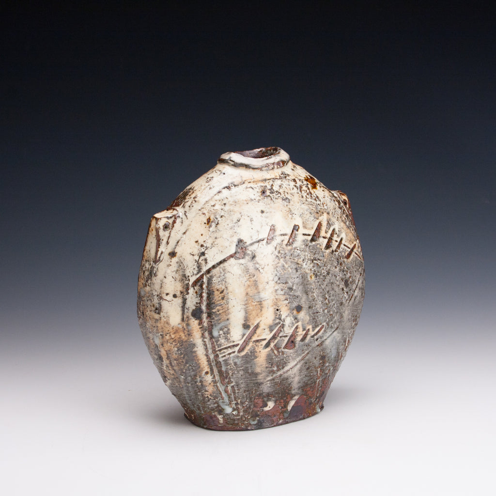 Wood fired local red clay. White slip, finger wipes clear glaze. 6.5 x 3 x 3.25