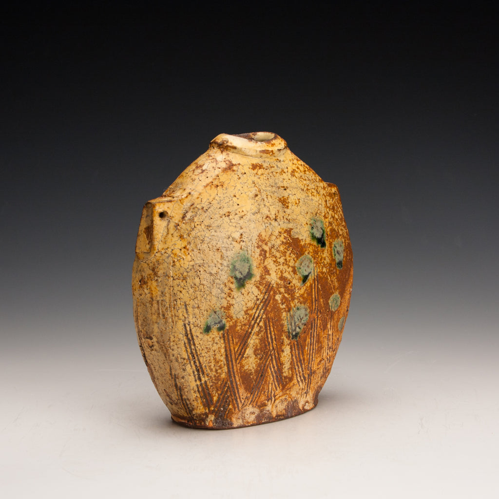 Wood fired local red clay. Yellow glaze and oribe green. 6.5 x 3 x 3.25