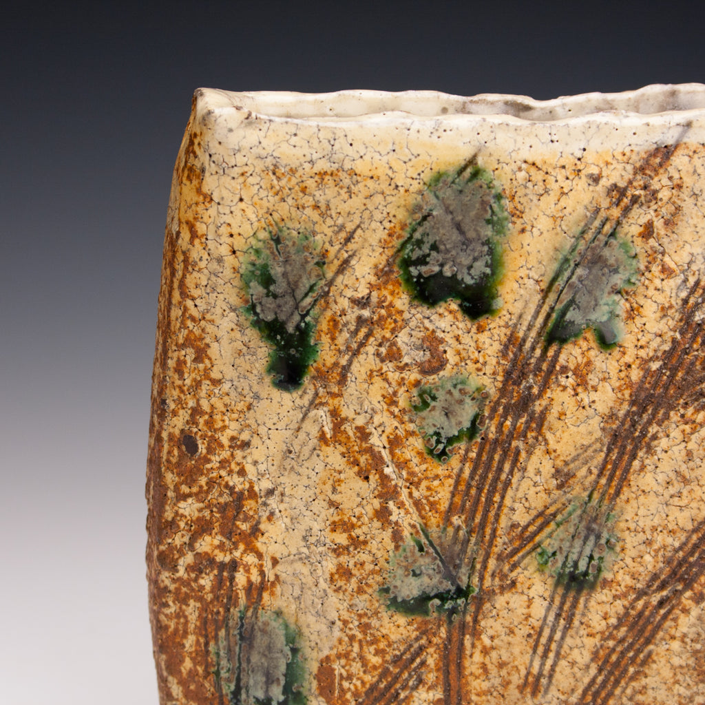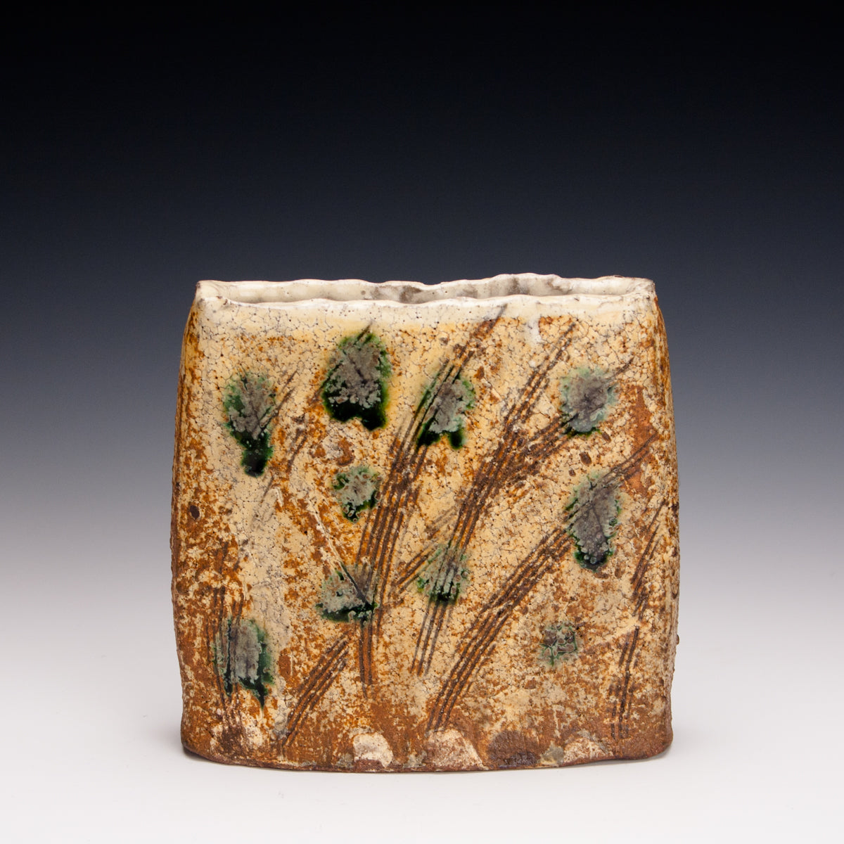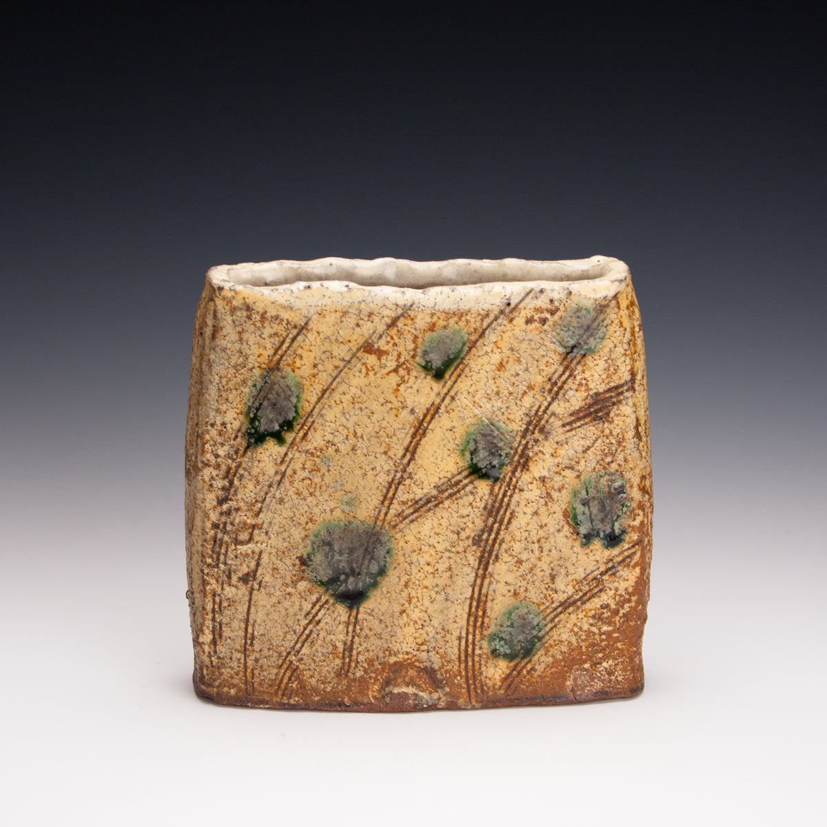 Wood fired local red clay. yellow glaze and green dots. 5.25 x 6 x 2.5