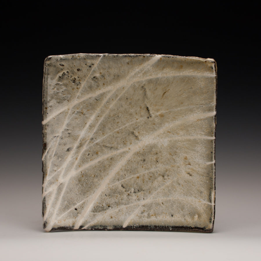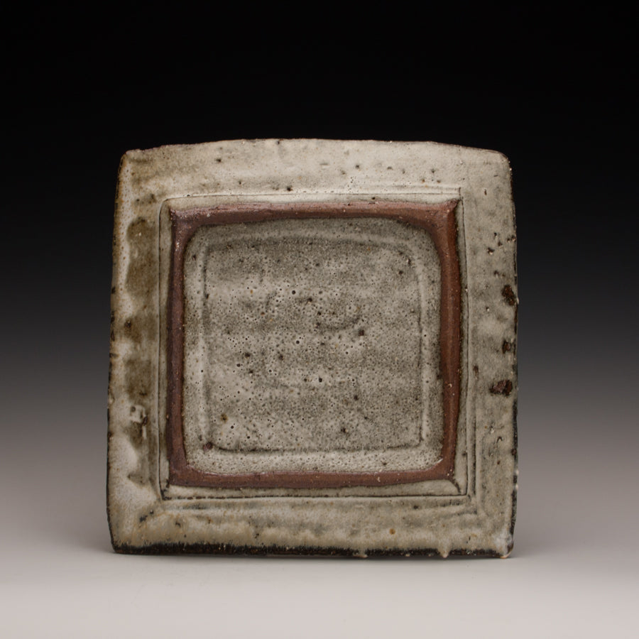 Wood fired local red clay. White slip and nuke glaze. 9 x 1.75
