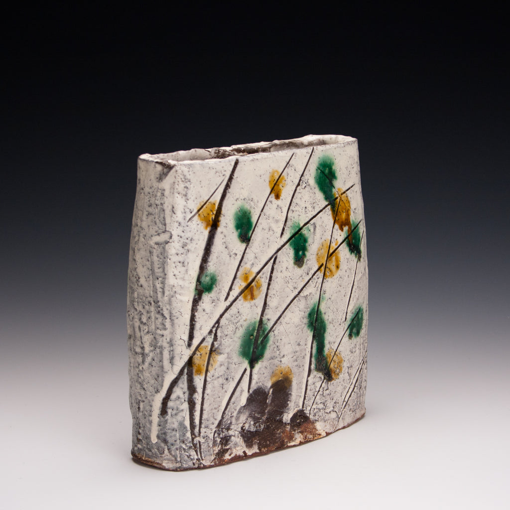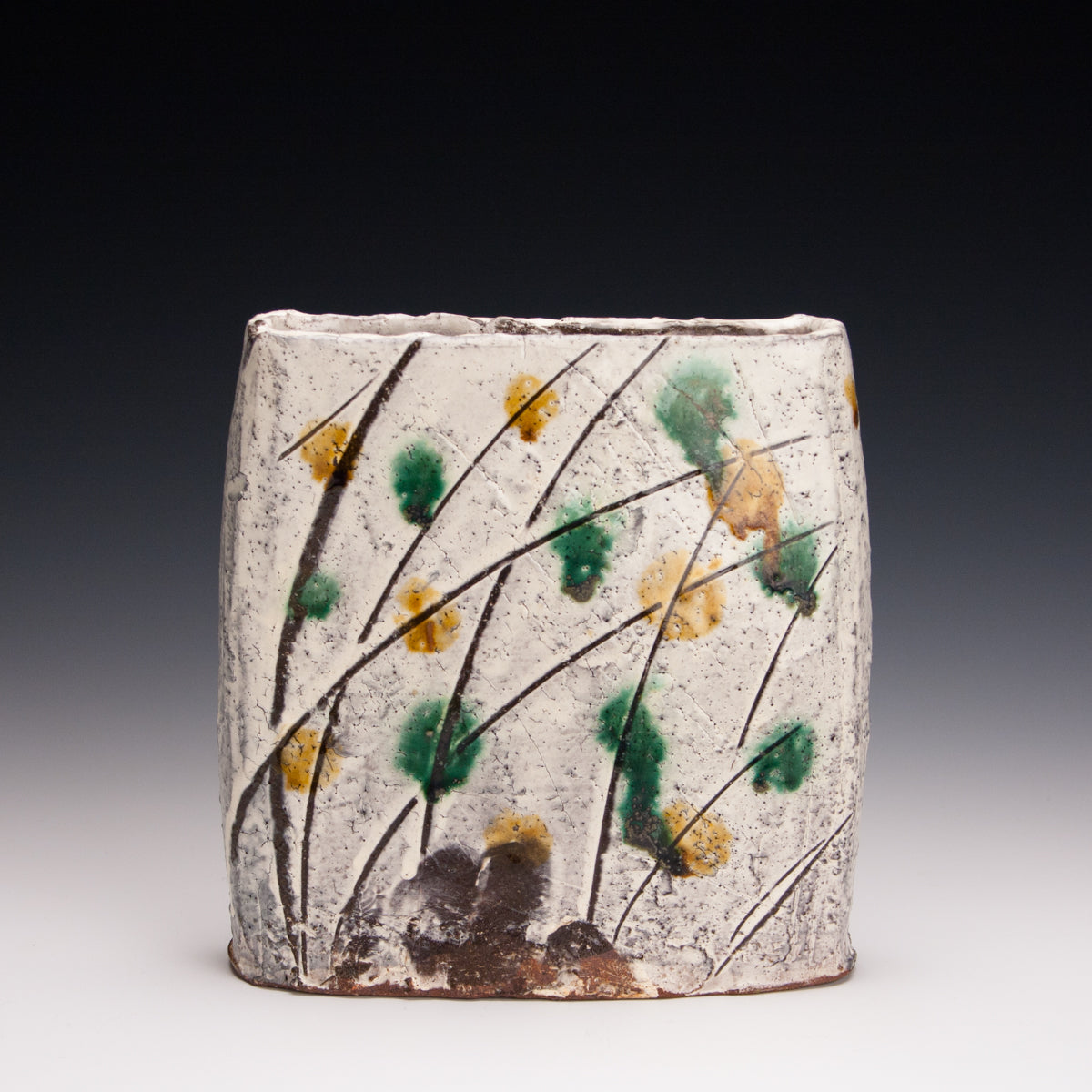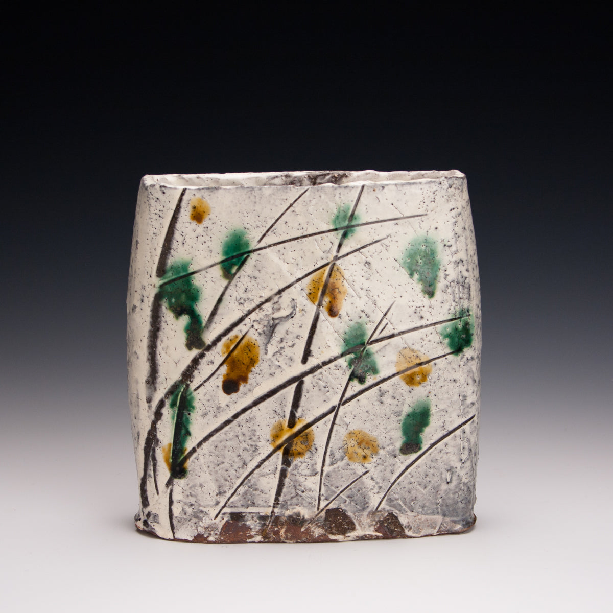 Wood fired local red clay. white slip and clear glaze with green and amber dots. 6.5 x 6.5 x 2.5