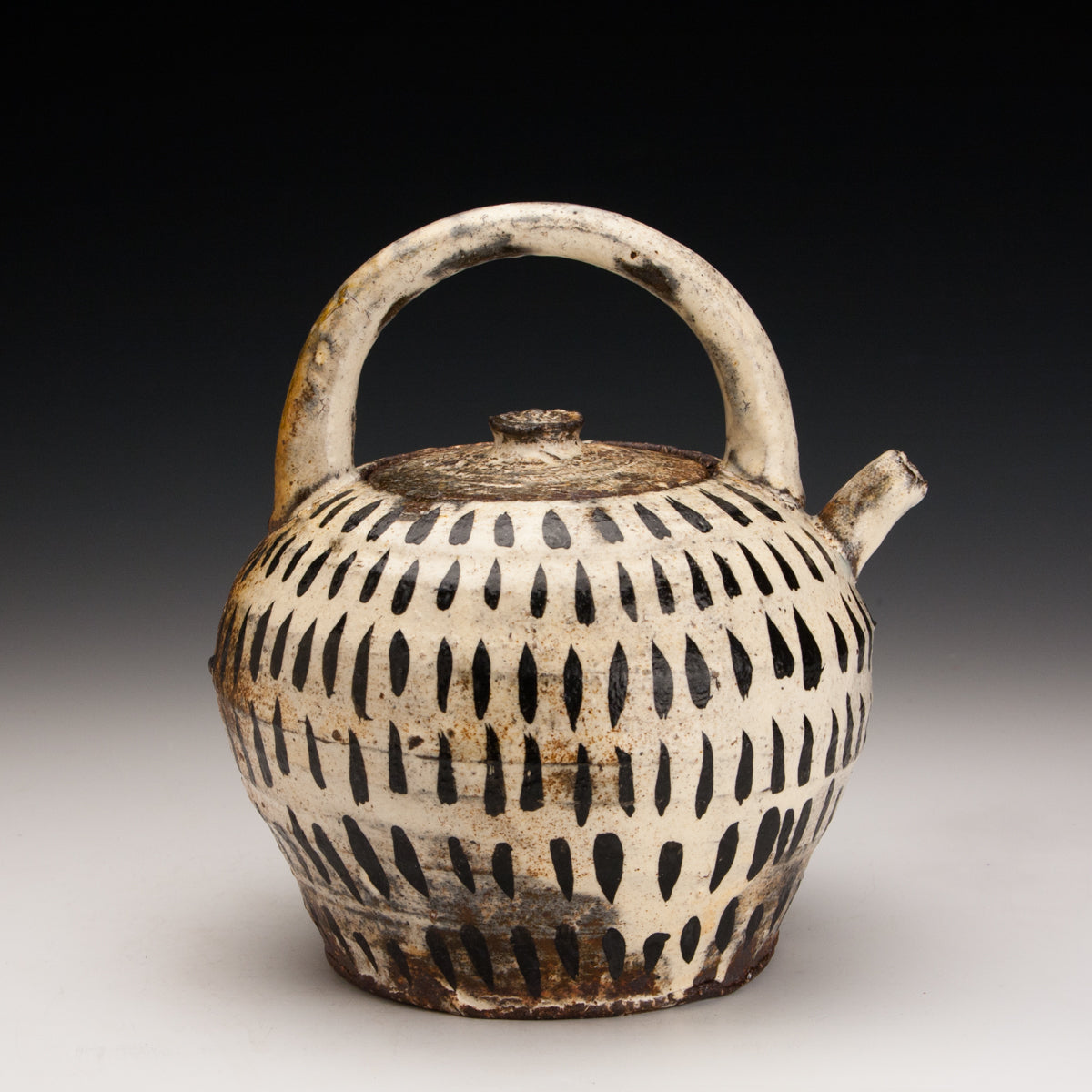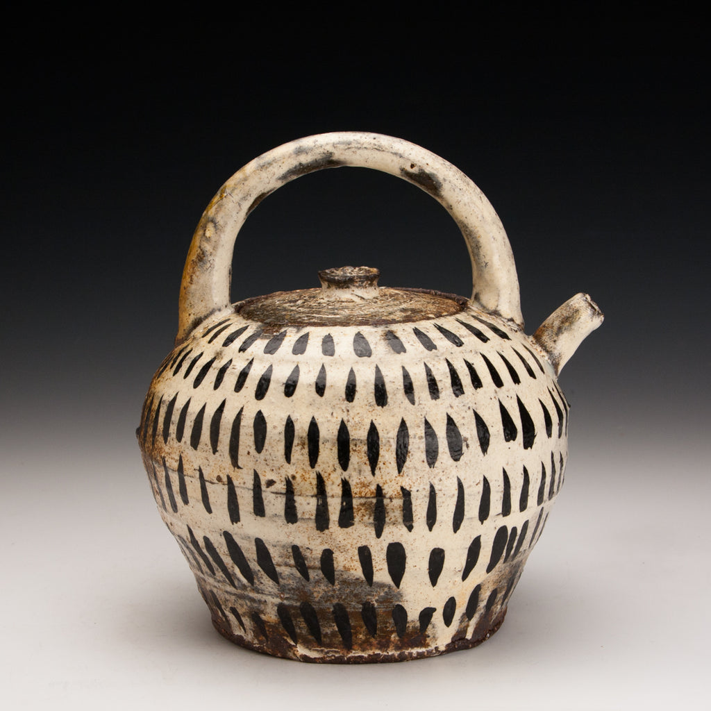 Wood fired local red clay. bandana kaolin, black deco and punchong glaze. 7.5 x 7